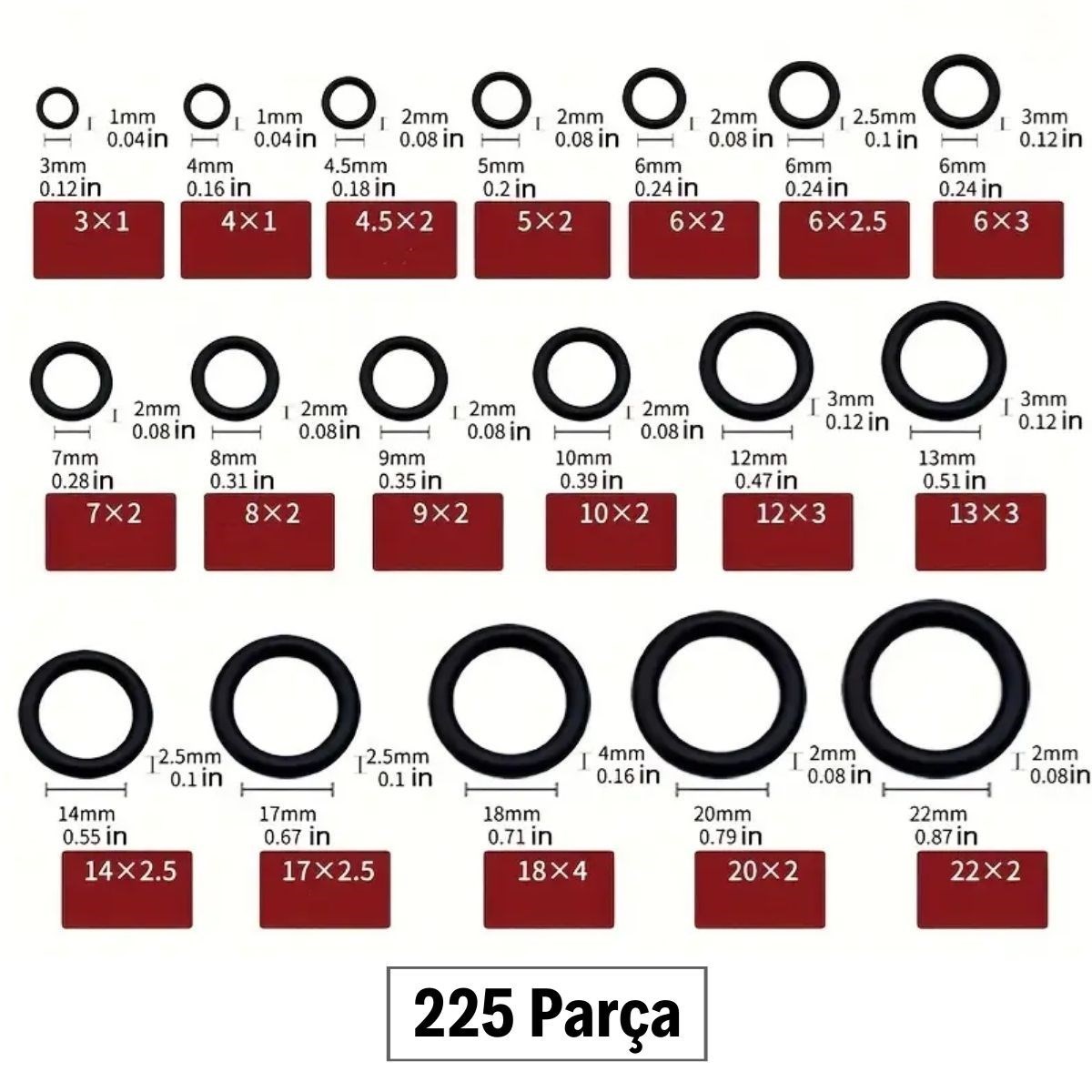 - 225 Parça İçerik: Farklı boyut ve şekillerde toplam 225 adet kauçuk conta, geniş bir uygulama yelpazesi sunar.