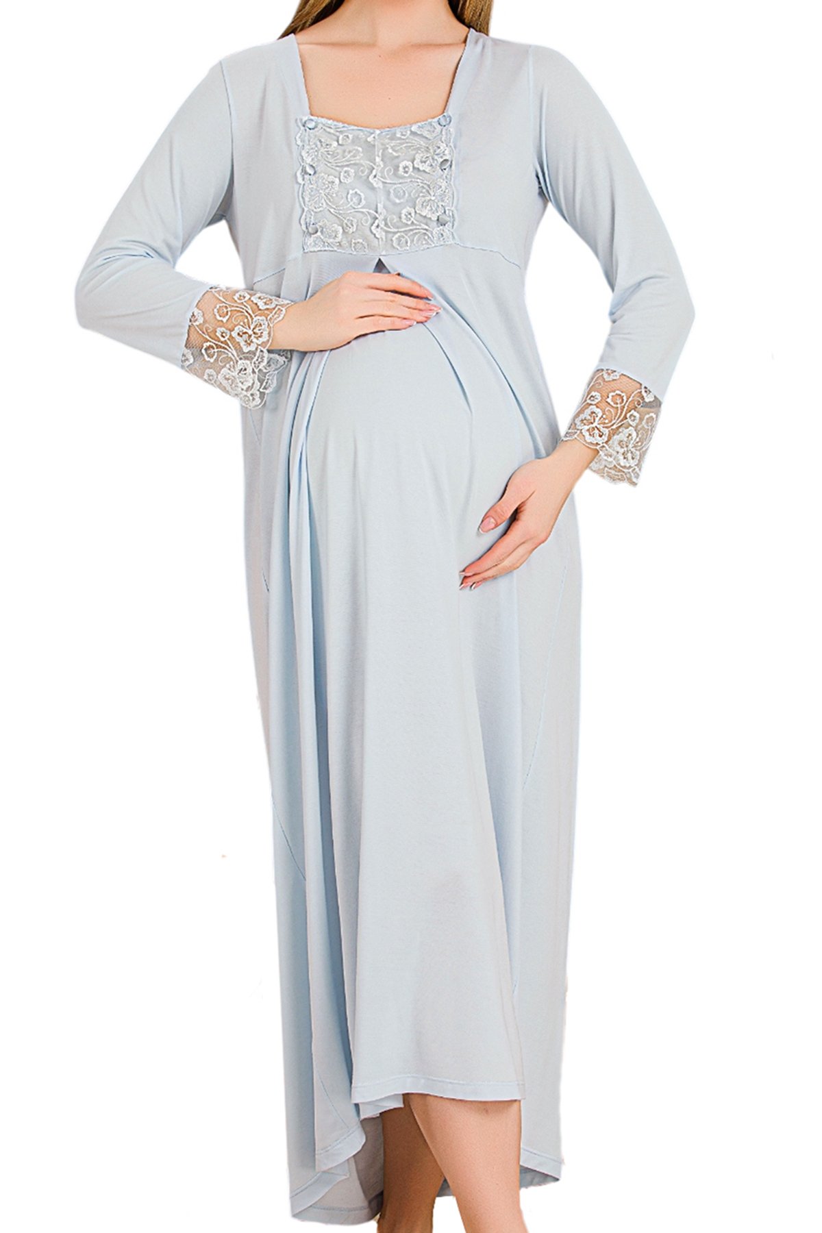 Zarafet ve Konforun Buluşması: Bebek Mavisi Renkli Dantel Detaylı Uzun Kollu Lohusa Gecelik