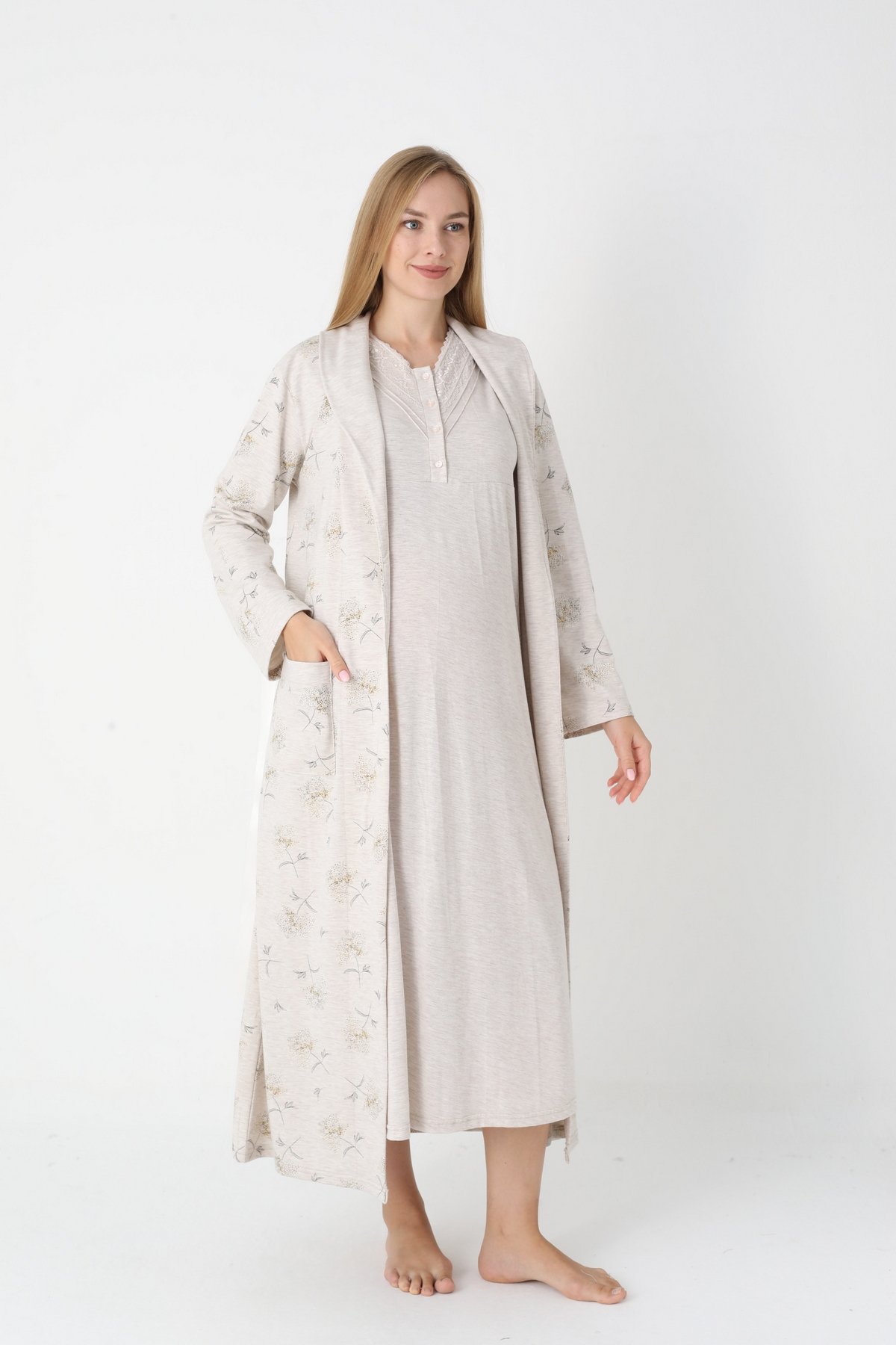 - Ürün İçeriği: Gecelik (düğmeli emzirme özelliği) ve Sabahlık (penye + kuşaklı).