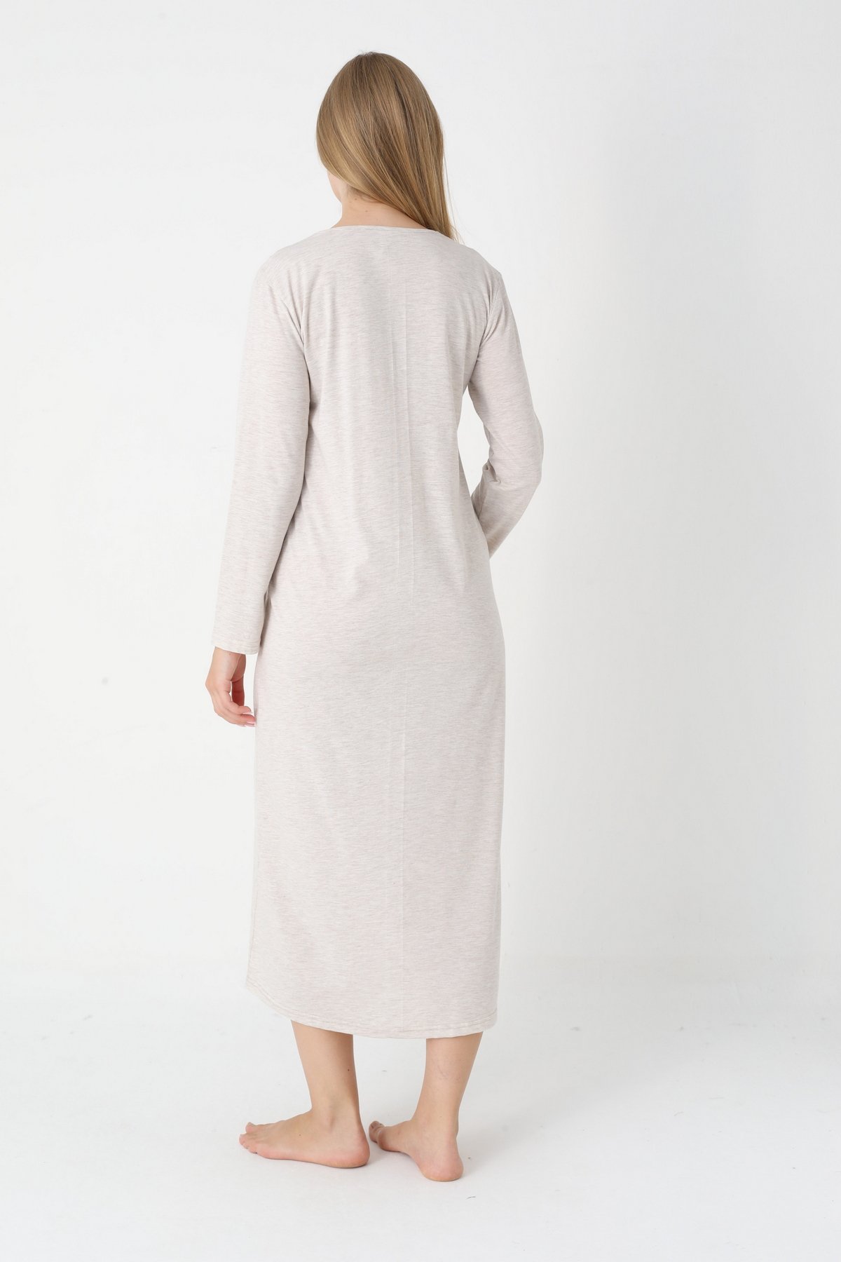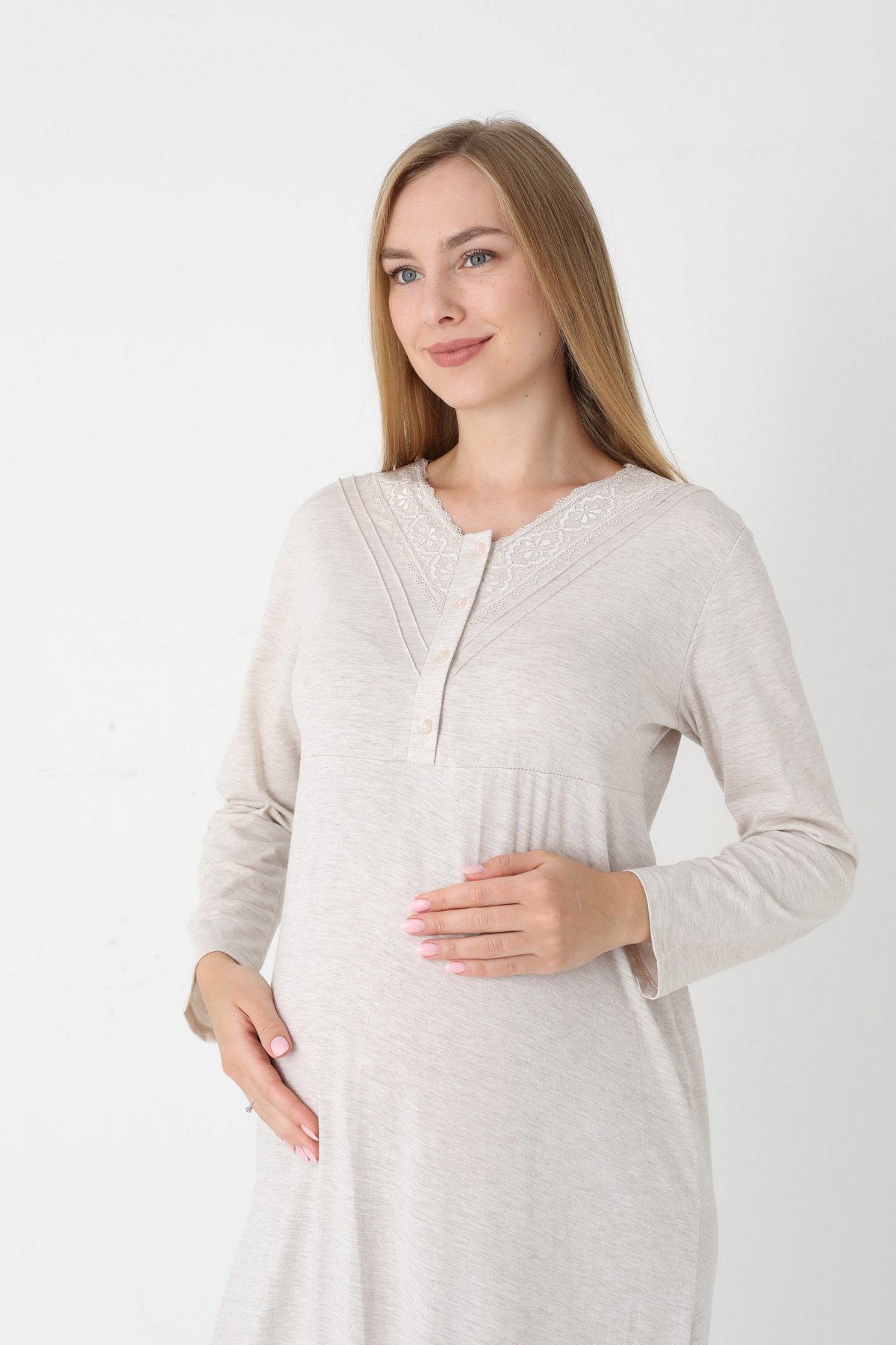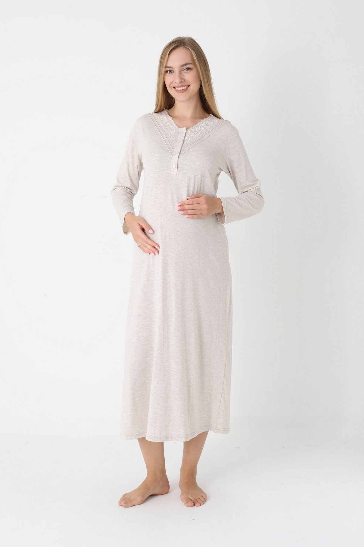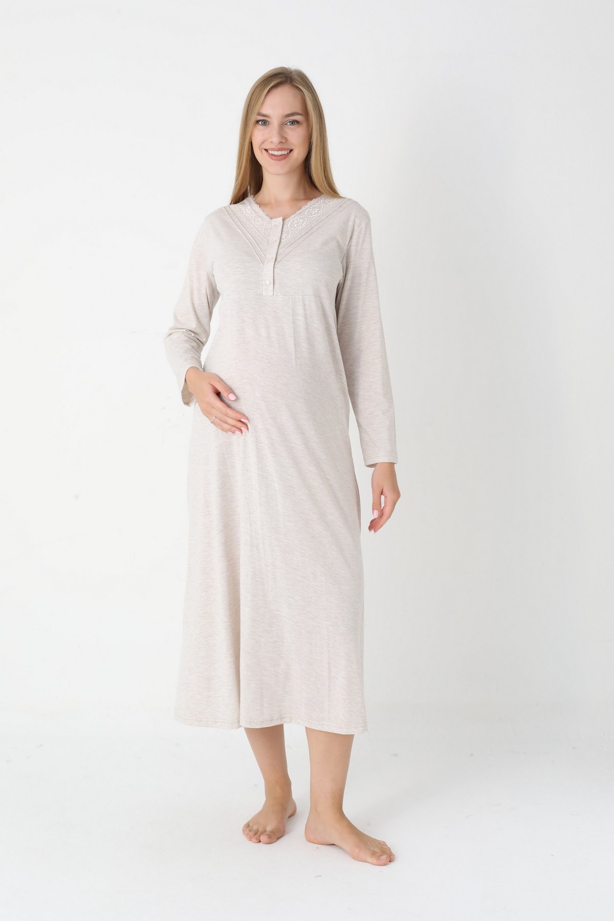 Bej Renkli Dantel Detaylı Uzun Kollu 2310 Lohusa/Hamile Gecelik Takım - Kolay Emzirme | QuillingSeti.com