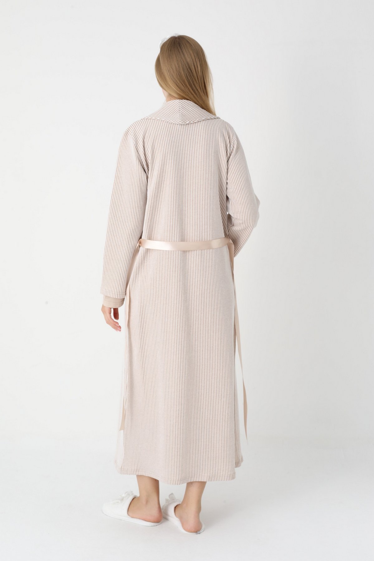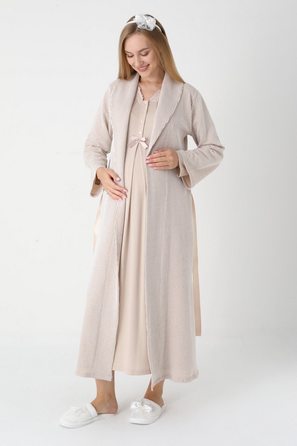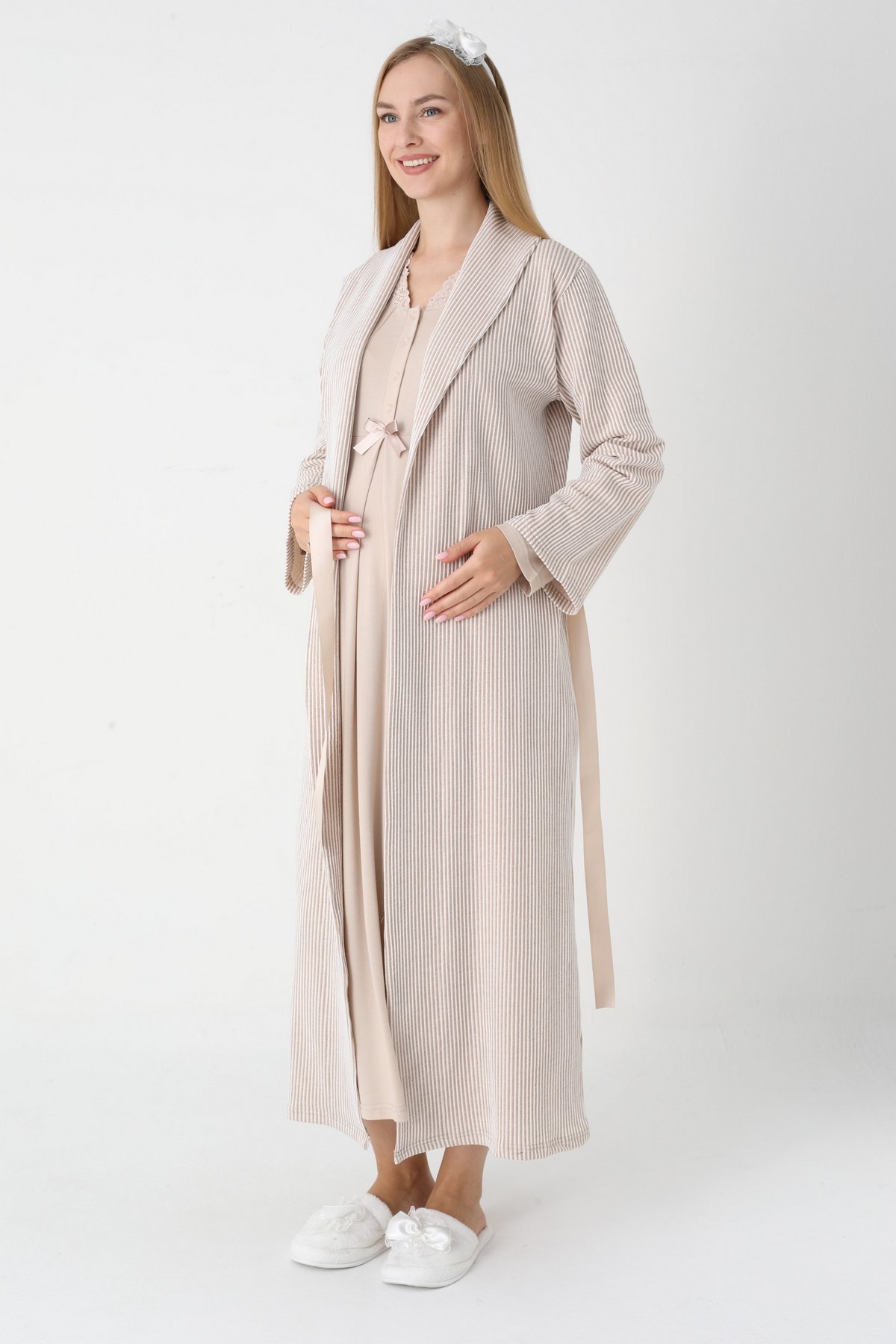 Bej Renkli, Jakarlı Çizgili ve Dantel Detaylı Lüks Erdeniz Lohusa & Hamile Seti (Jakarlı Uzun Sabahlık & Viskon Gecelik Takım)