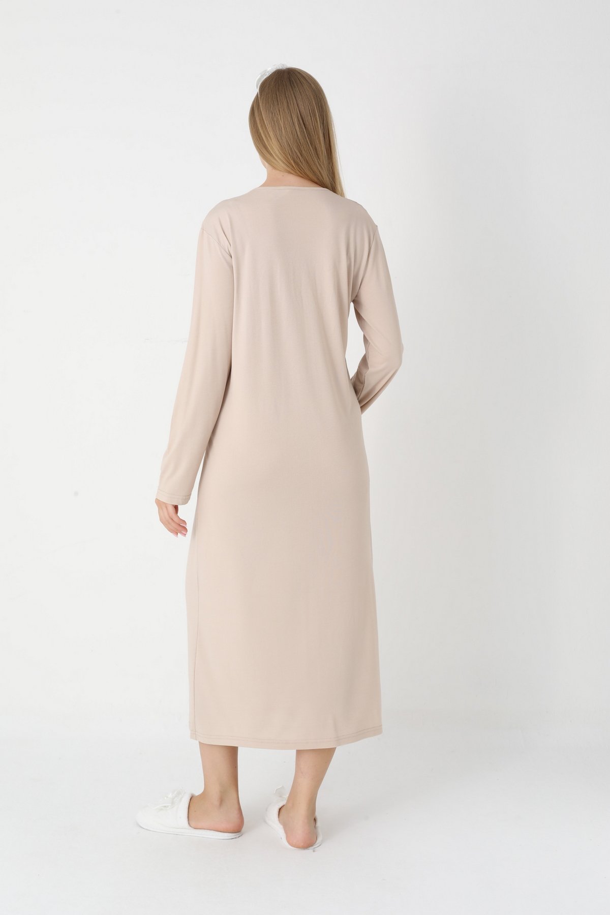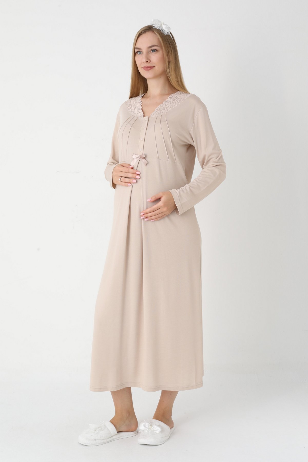 Bej Renkli, Dantel Detaylı, Uzun Kollu Lüks Erdeniz 2305 Jakarlı Sabahlıklı Lohusa -Hamile Pijama Takımı | QuillingSeti.com