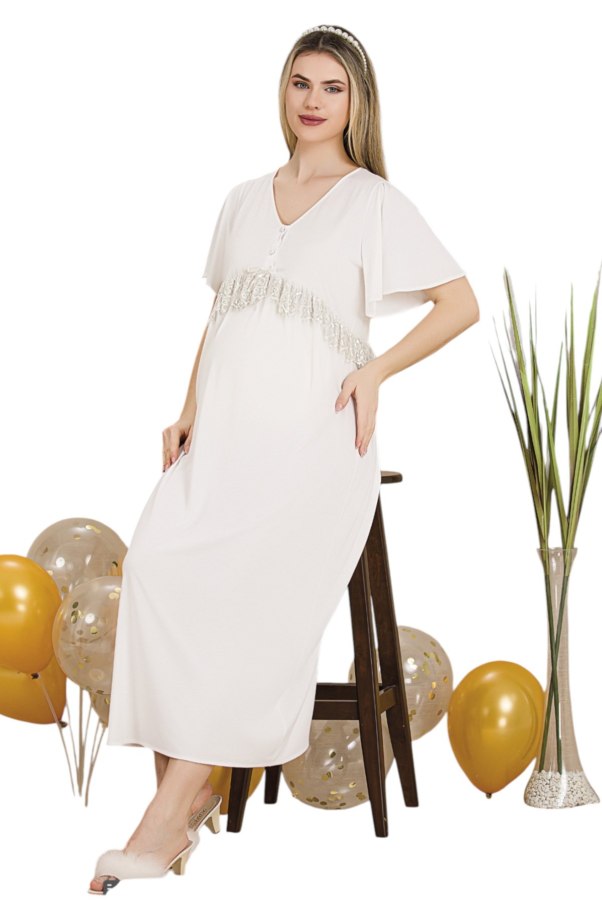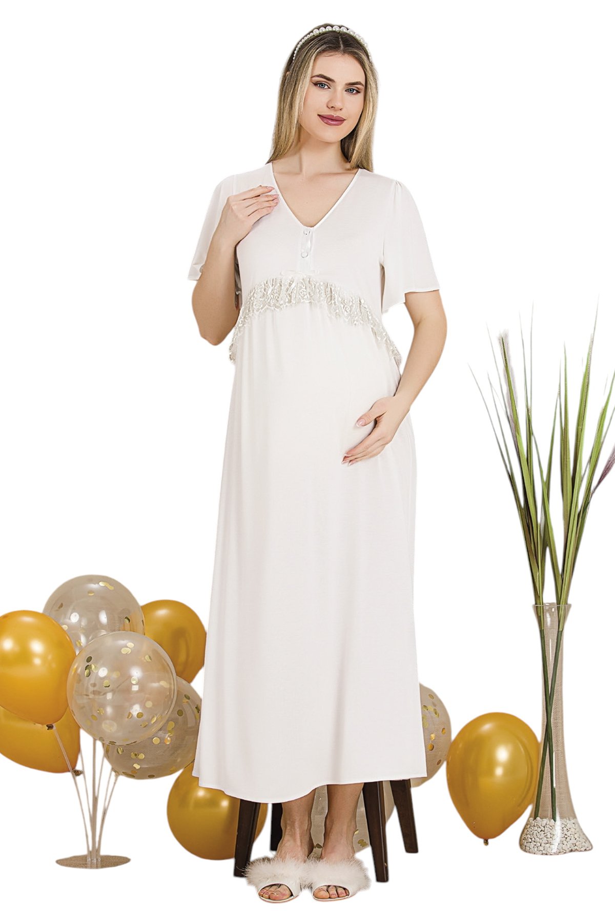 Zarif Dantel Detaylar: Yaka ve kol kısımlarındaki sofistike dantel süslemeler, lohusalık sürecinize zarafet katar; doğum fotoğrafları için mükemmel bir görünüm sağlar.