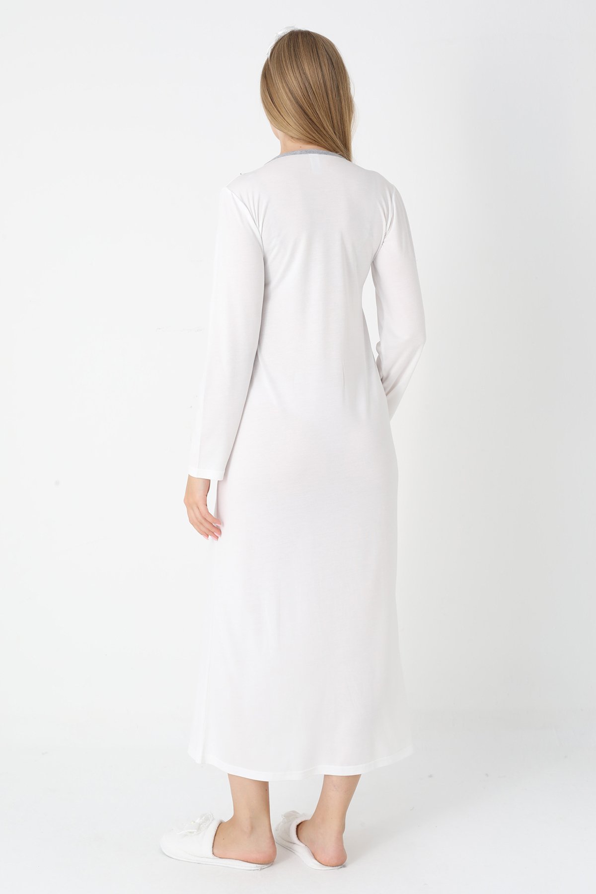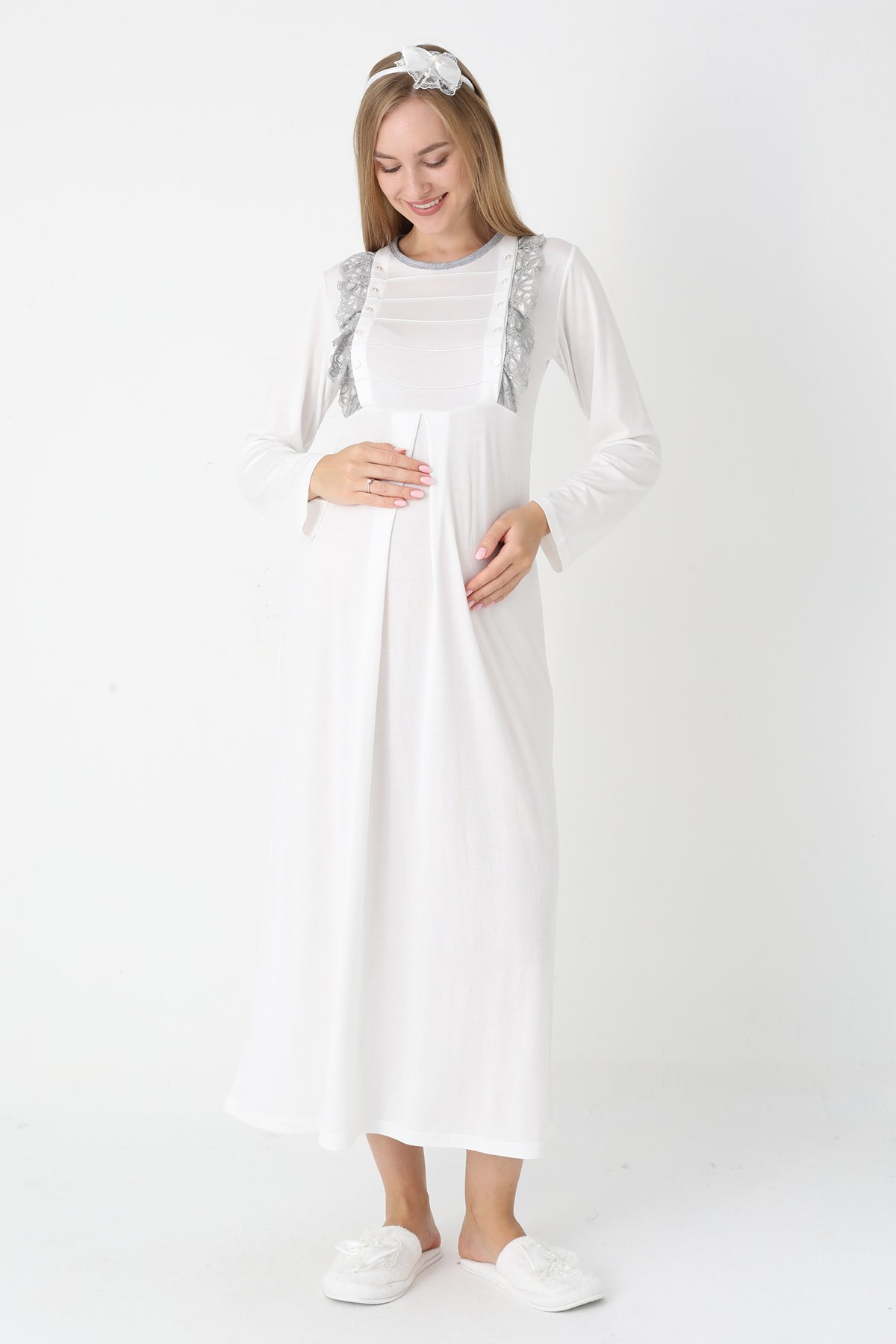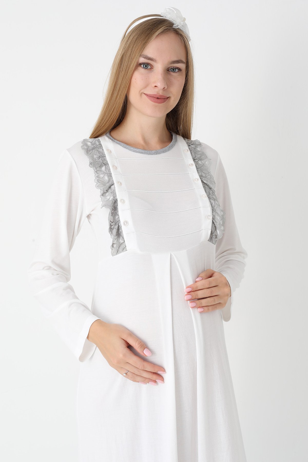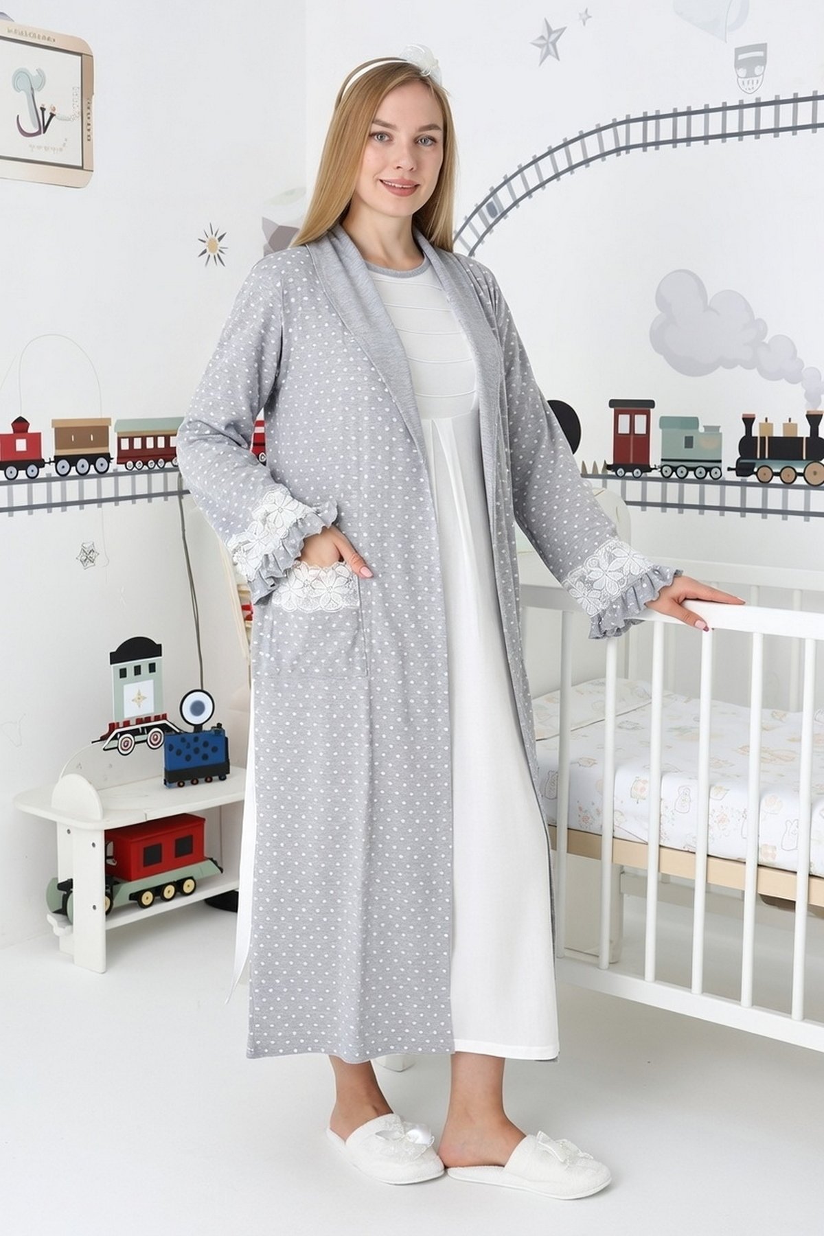 Gri Renkli, Paunatiyeli, Dantel Detaylı, Uzun Kol Erdeniz 2308 Sabahlıklı Lohusa Hamile Gecelik Takım - Kolay Emzirme | QuillingSeti.com