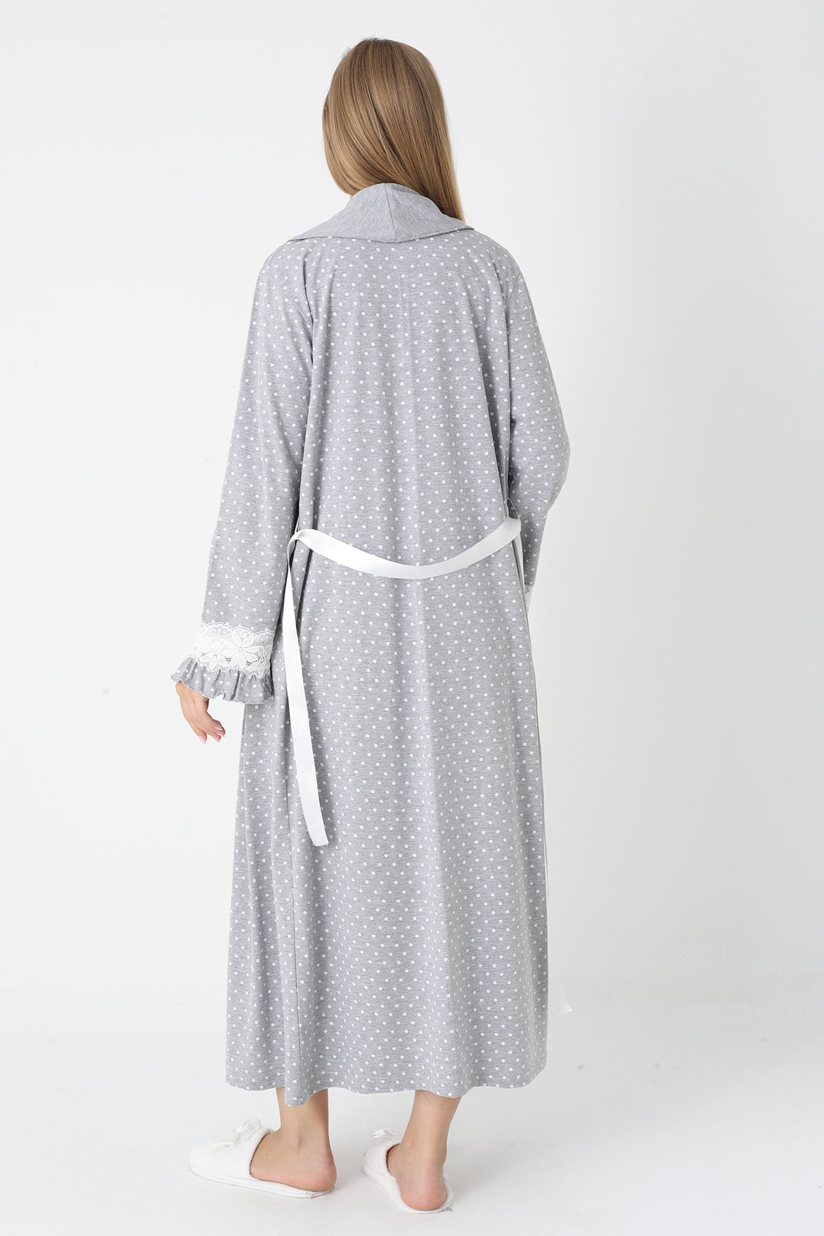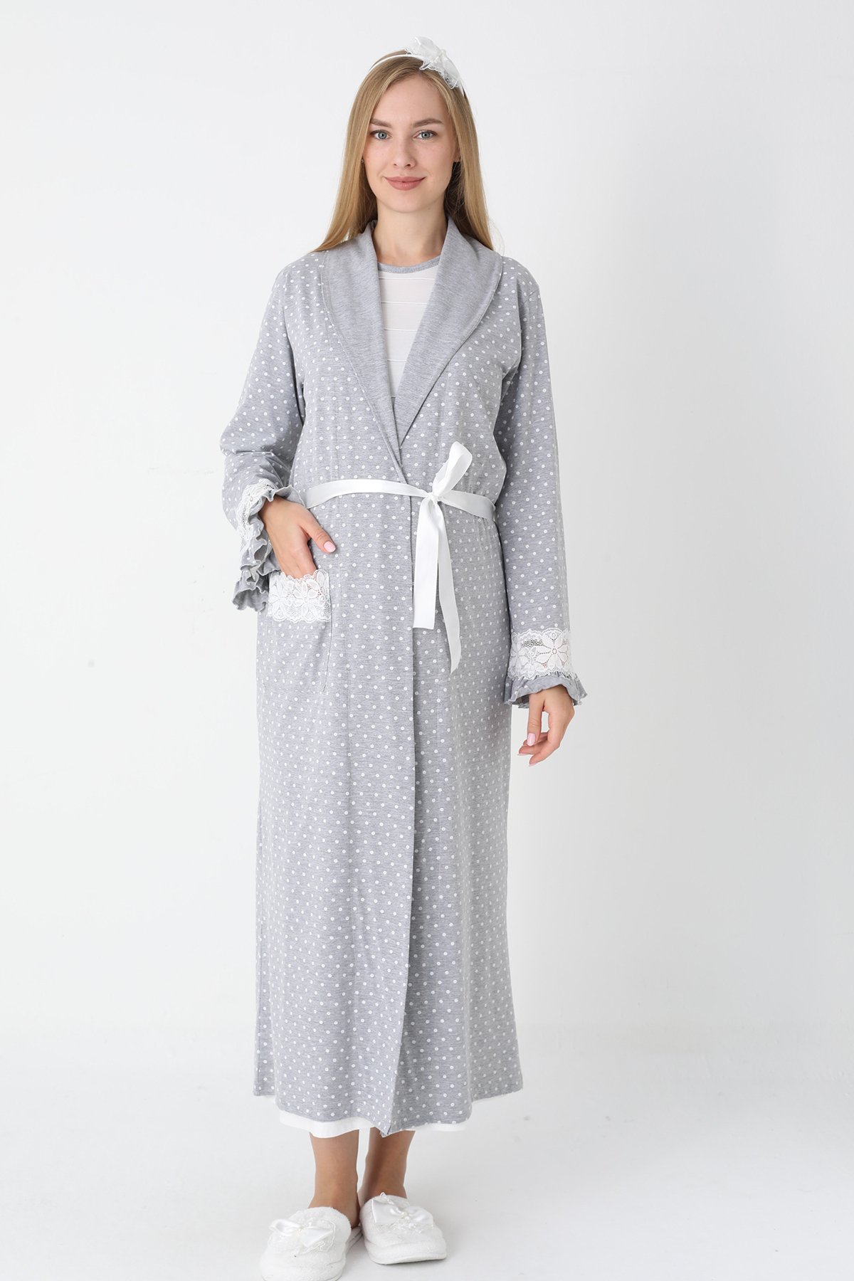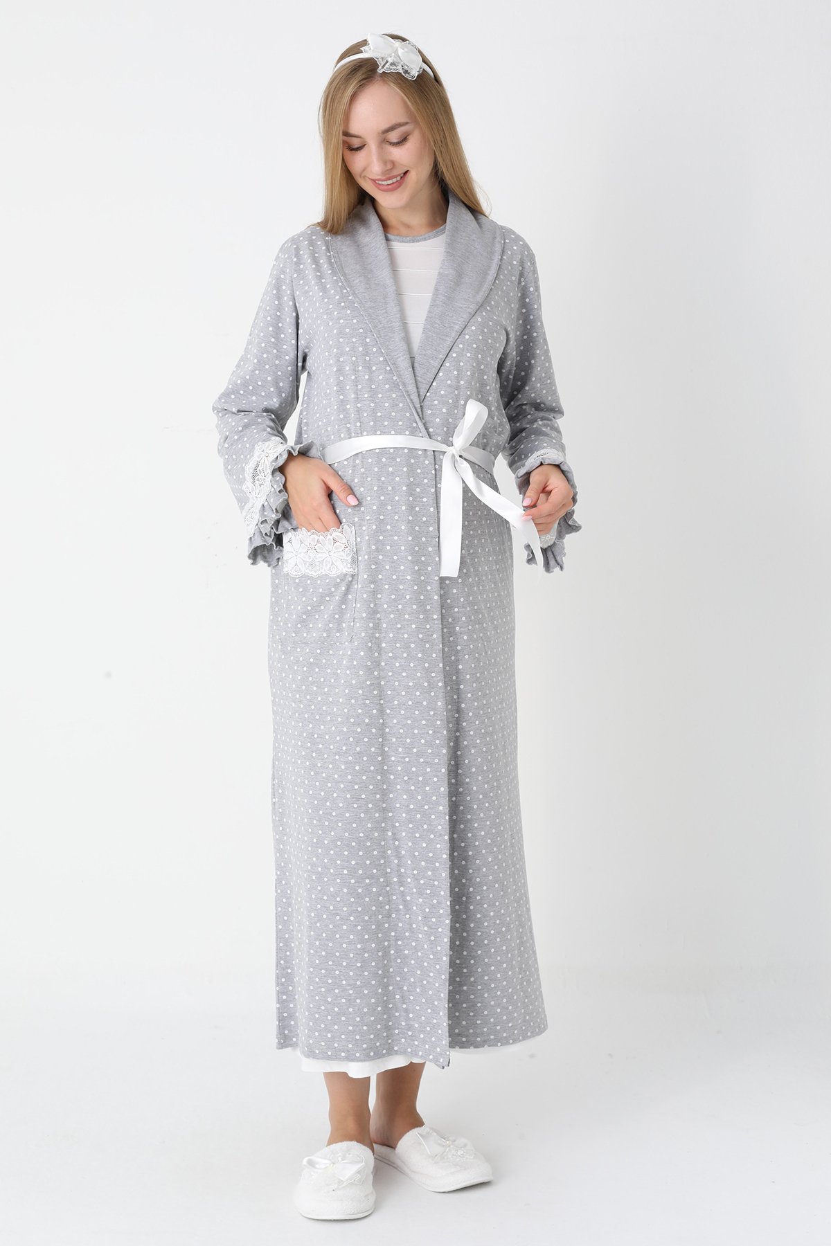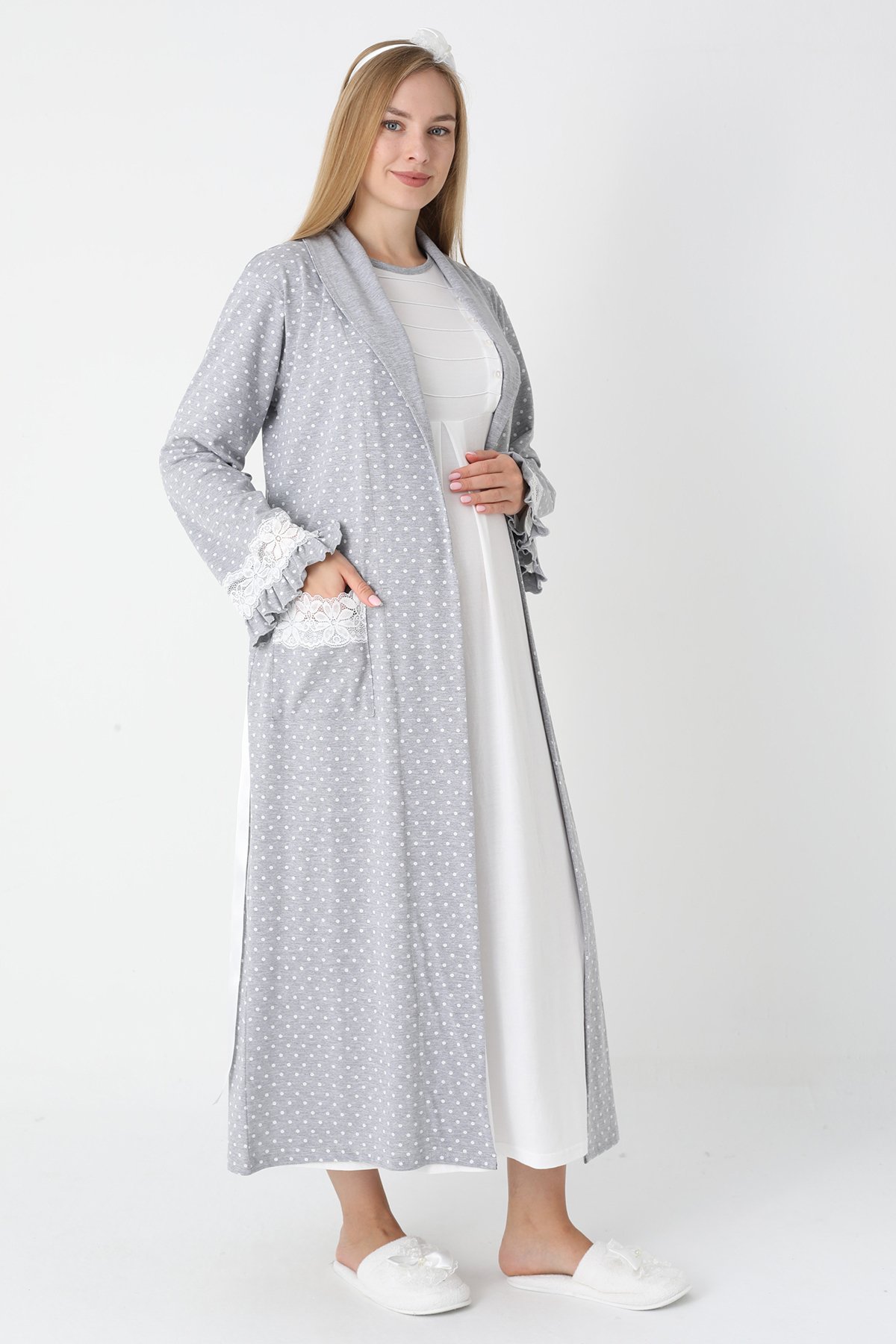 Gri Renkli, Puantiye Desenli ve Dantel Detaylı Lüks Erdeniz Lohusa & Hamile Seti (Penye Sabahlık & Viskon Gecelik Takım)