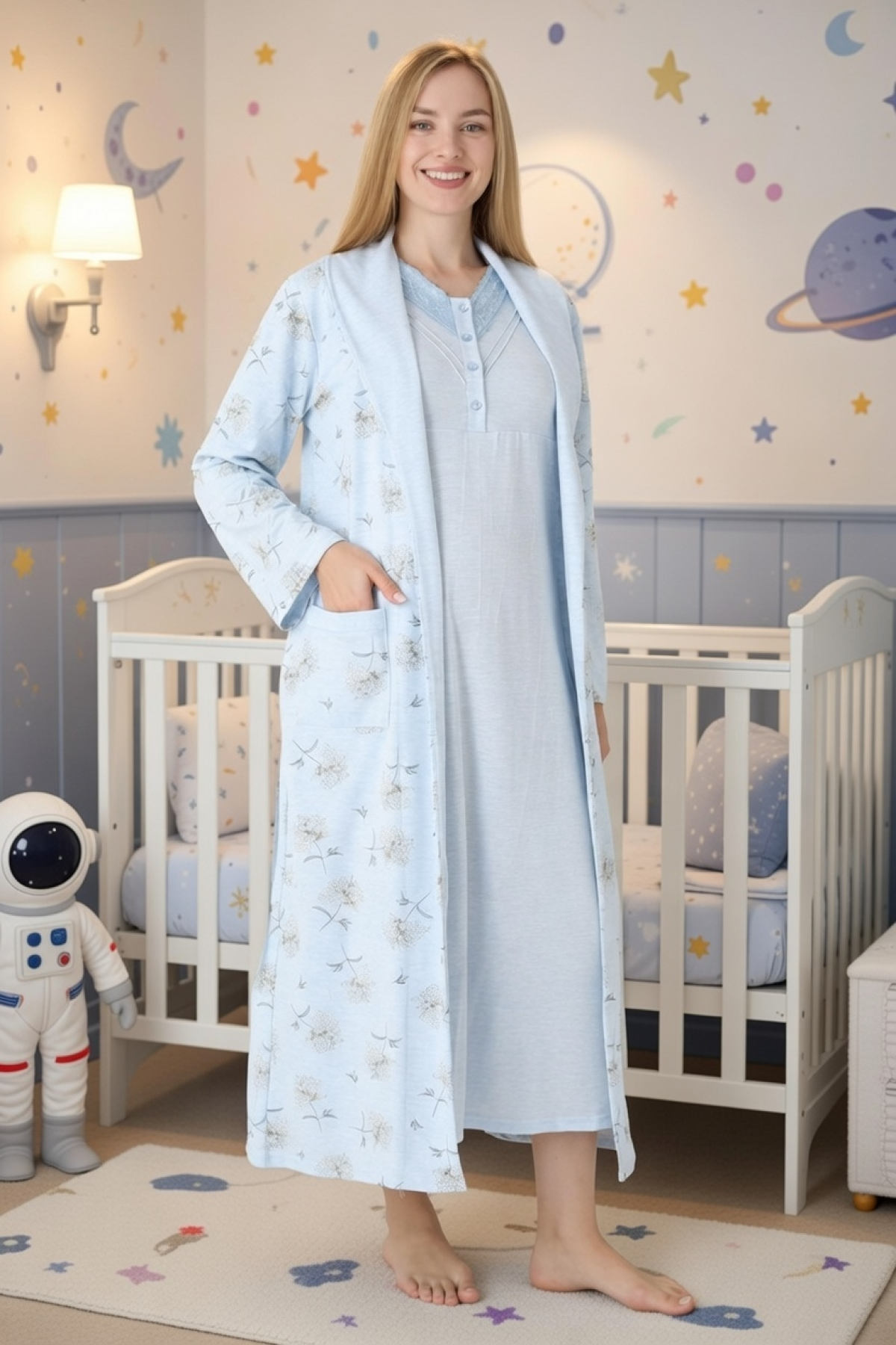 Çiçek Desenli 2 Parça Penye Lohusa & Hamile Gecelik ve Sabahlık Seti