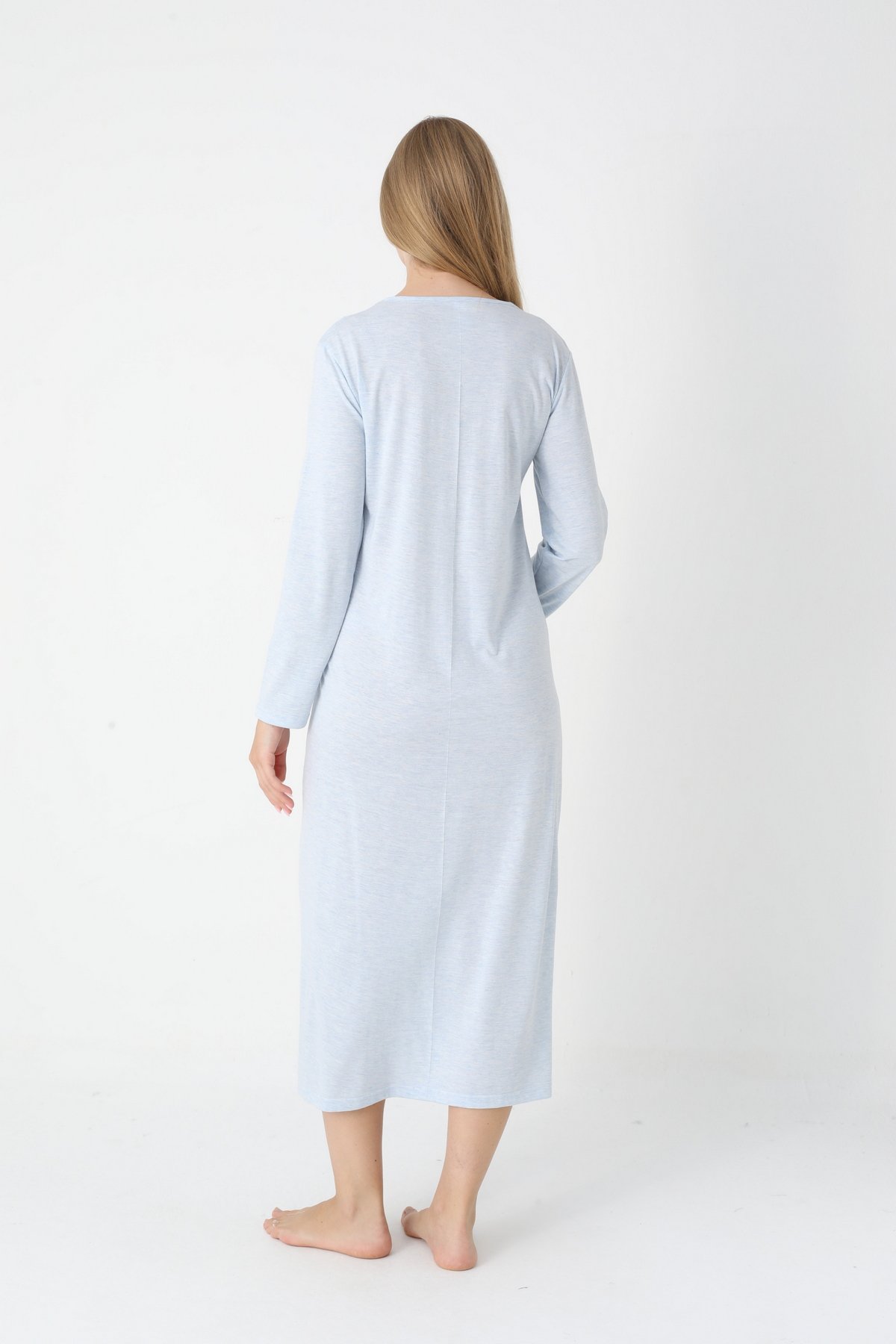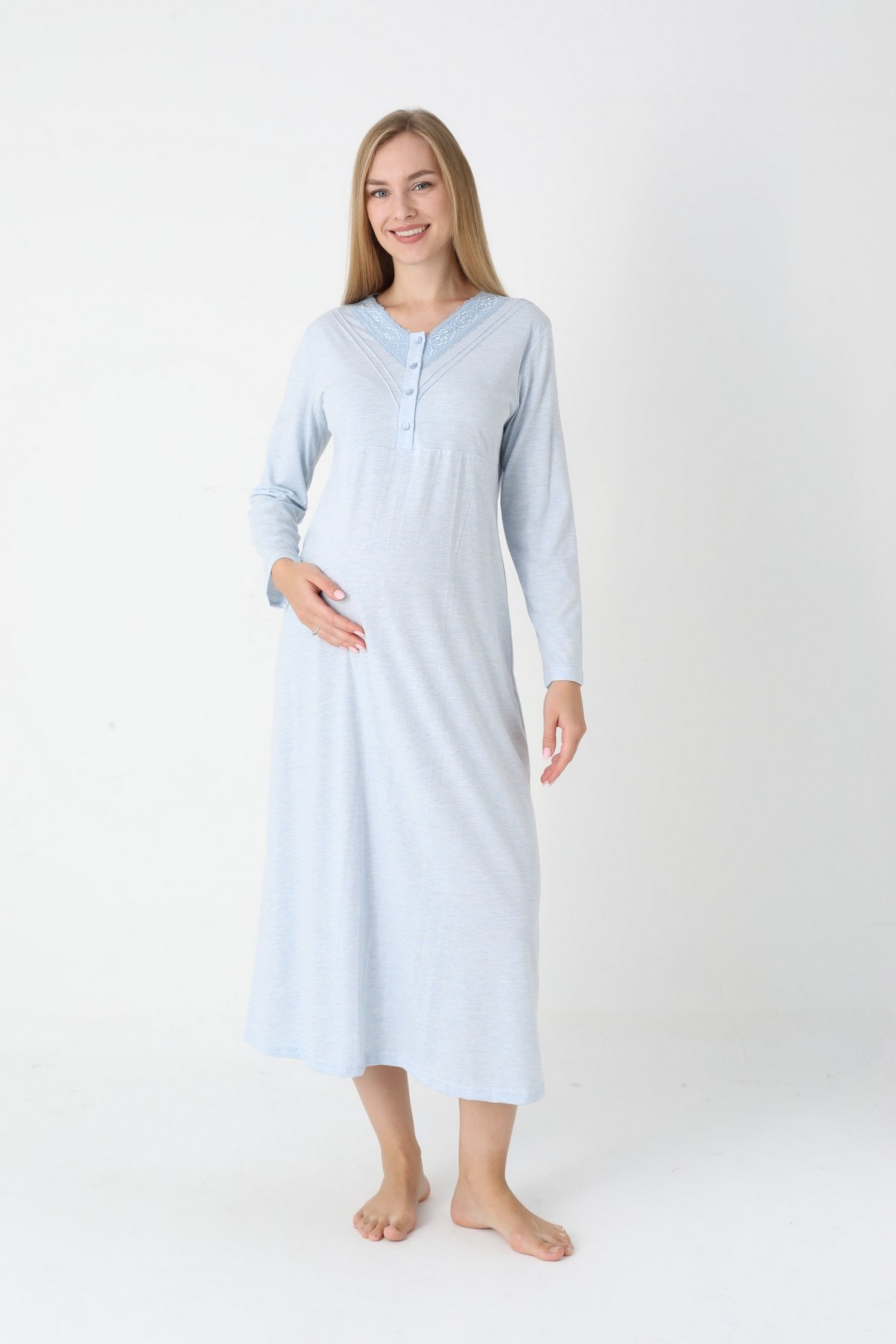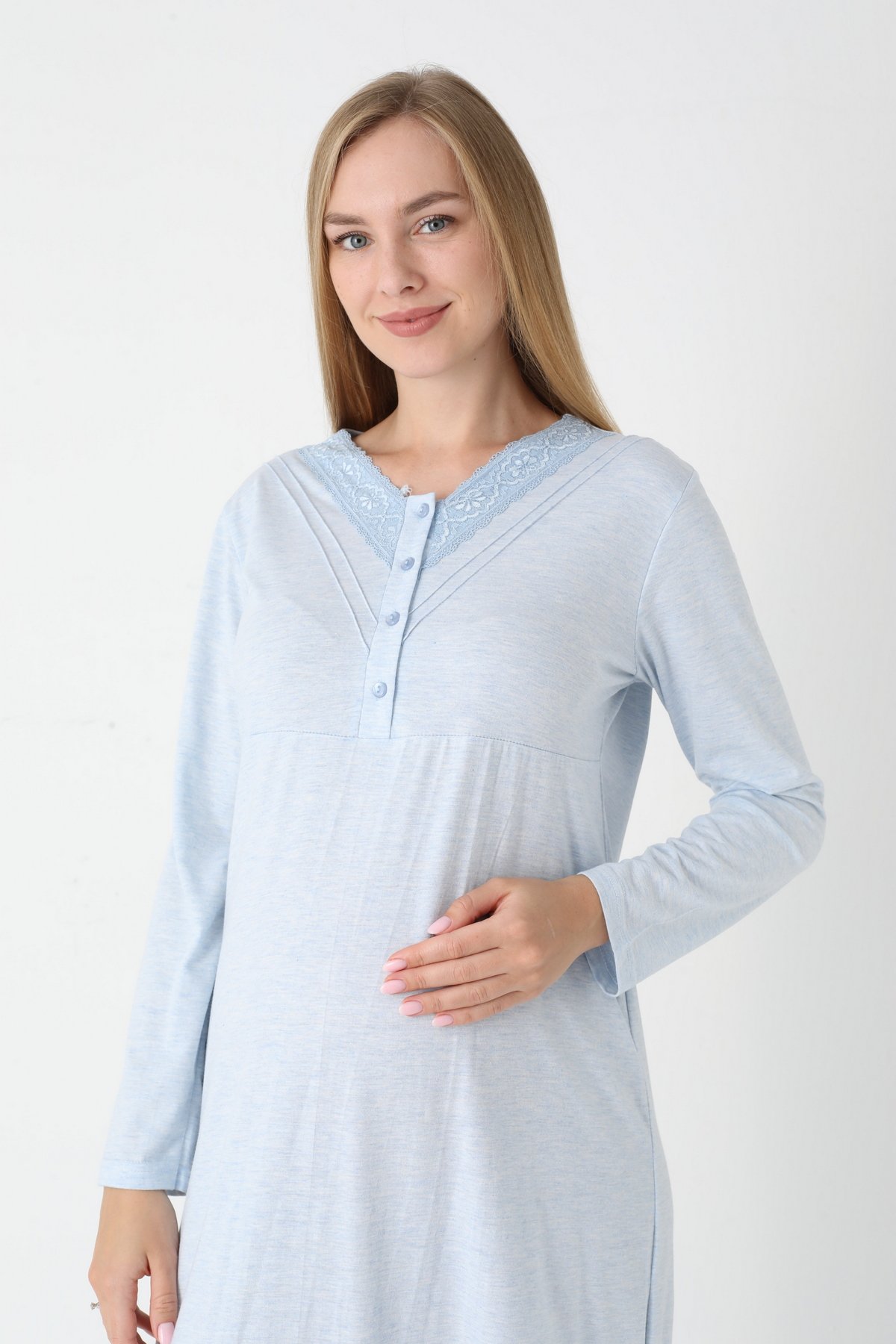 Mavi Renkli Dantel Detaylı Uzun Kollu 2310 Lohusa/Hamile Gecelik Takım - Kolay Emzirme | QuillingSeti.com