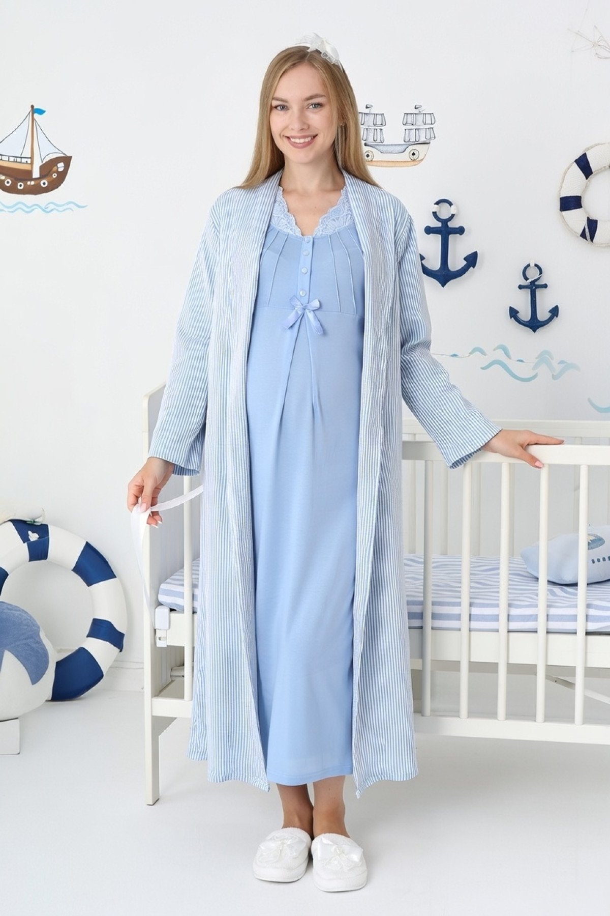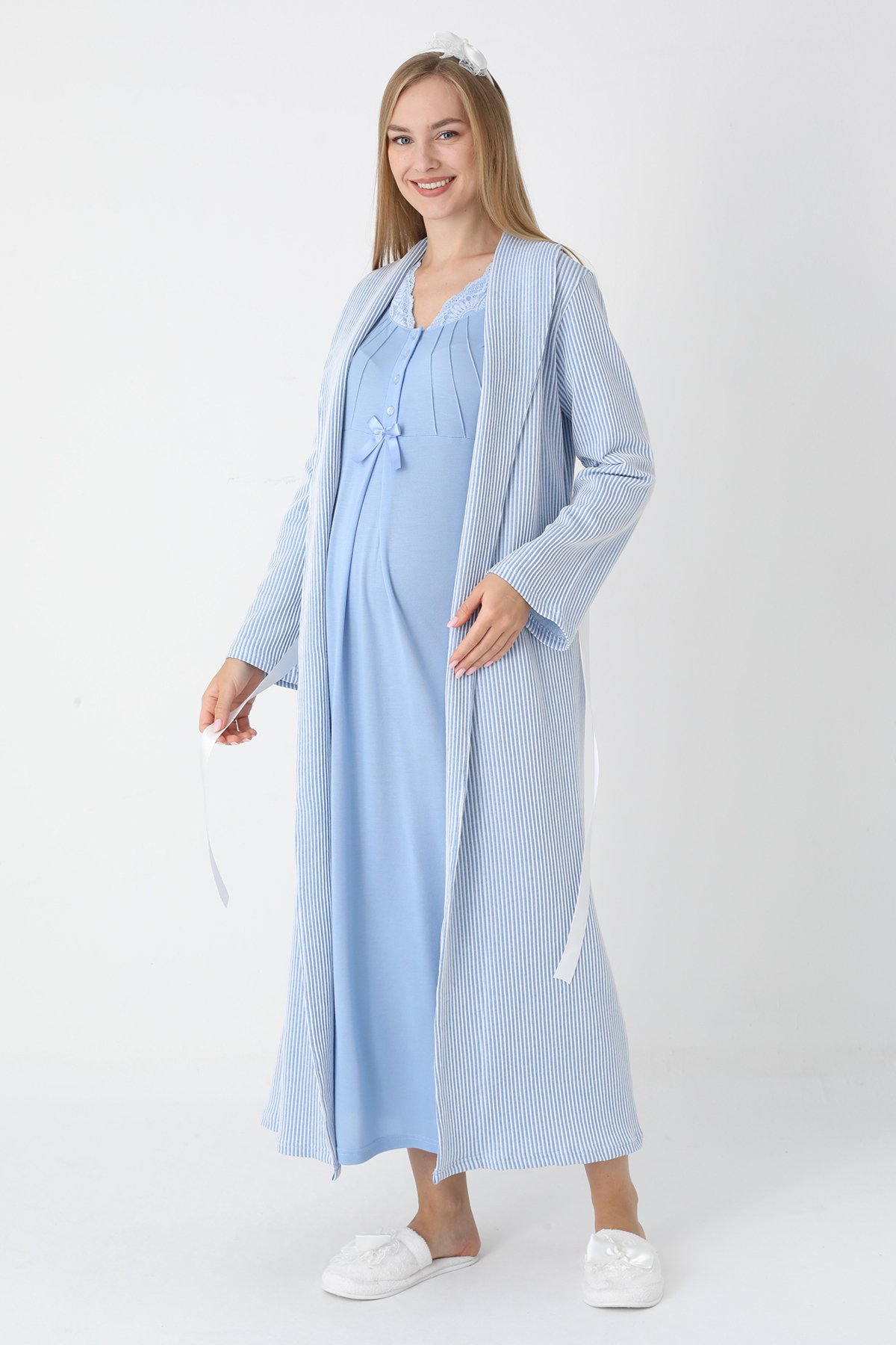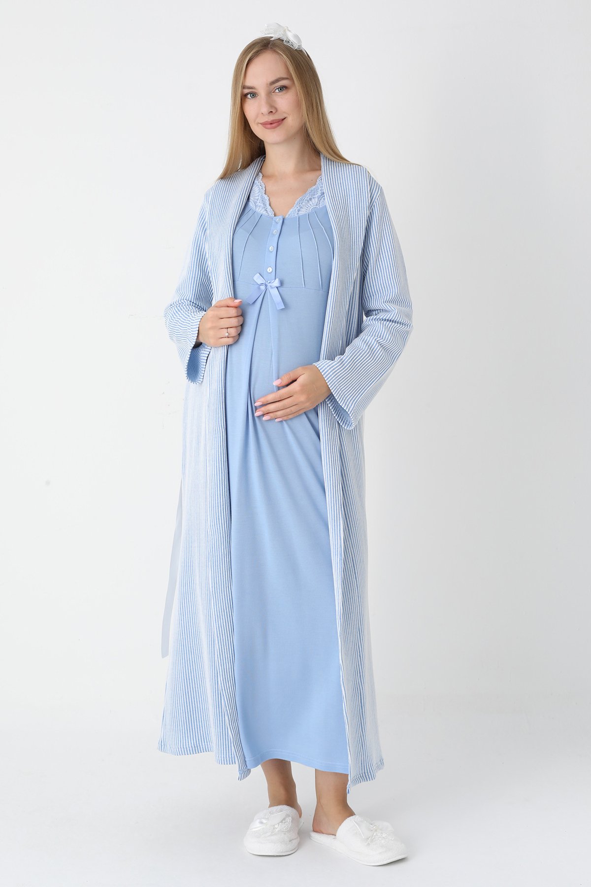 Mavi Renkli, Jakarlı Çizgili ve Dantel Detaylı Lüks Erdeniz Lohusa & Hamile Seti (Jakarlı Uzun Sabahlık & Viskon Gecelik Takım)