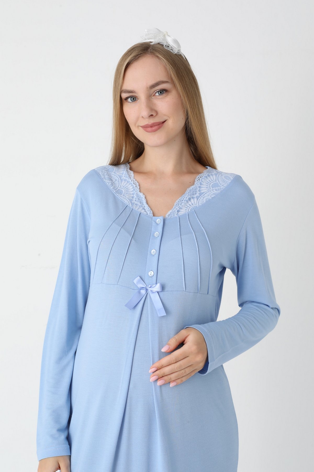 Mavi Renkli, Dantel Detaylı, Uzun Kollu Lüks Erdeniz 2305 Jakarlı Sabahlıklı Lohusa -Hamile Pijama Takımı | QuillingSeti.com