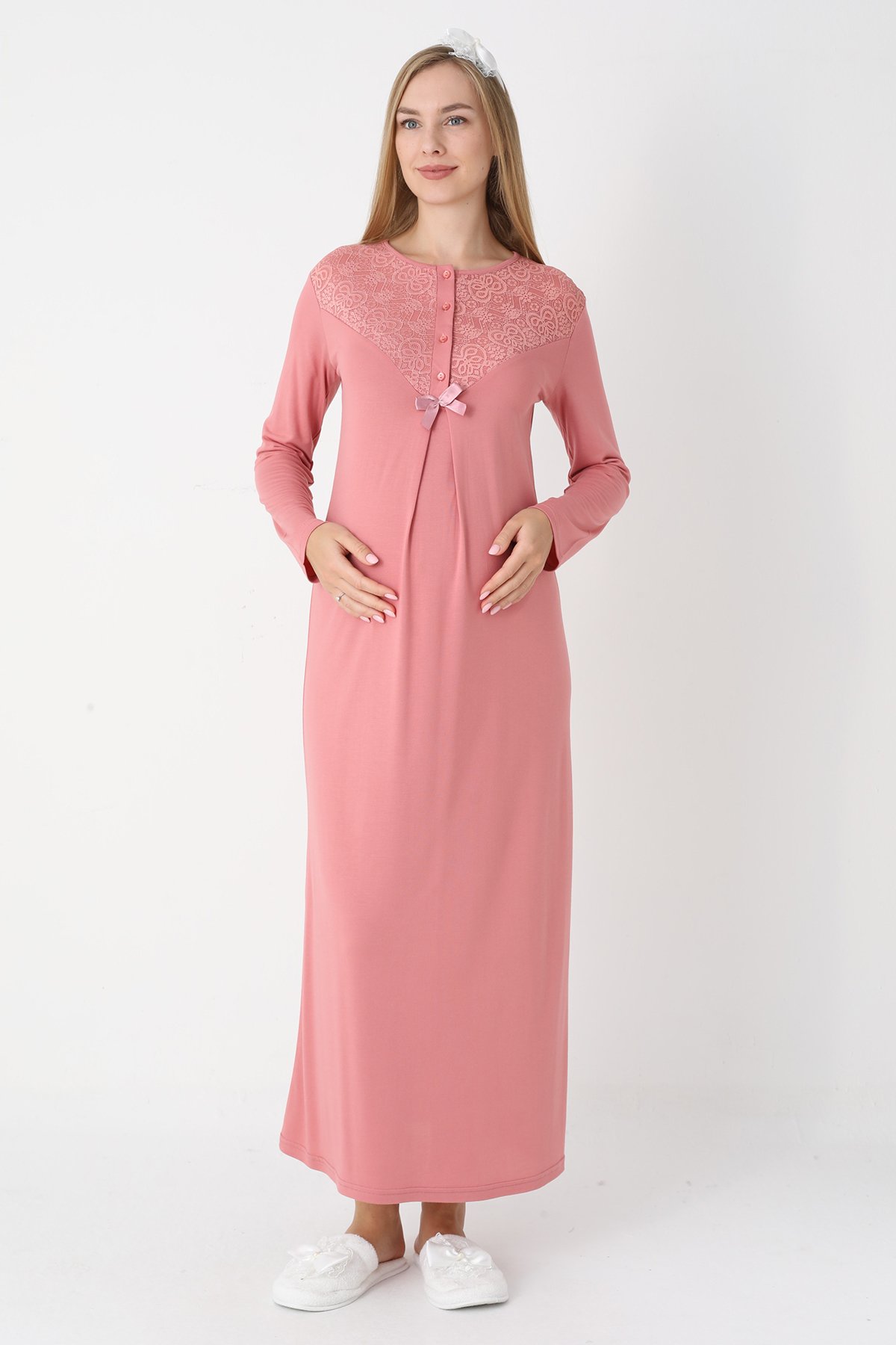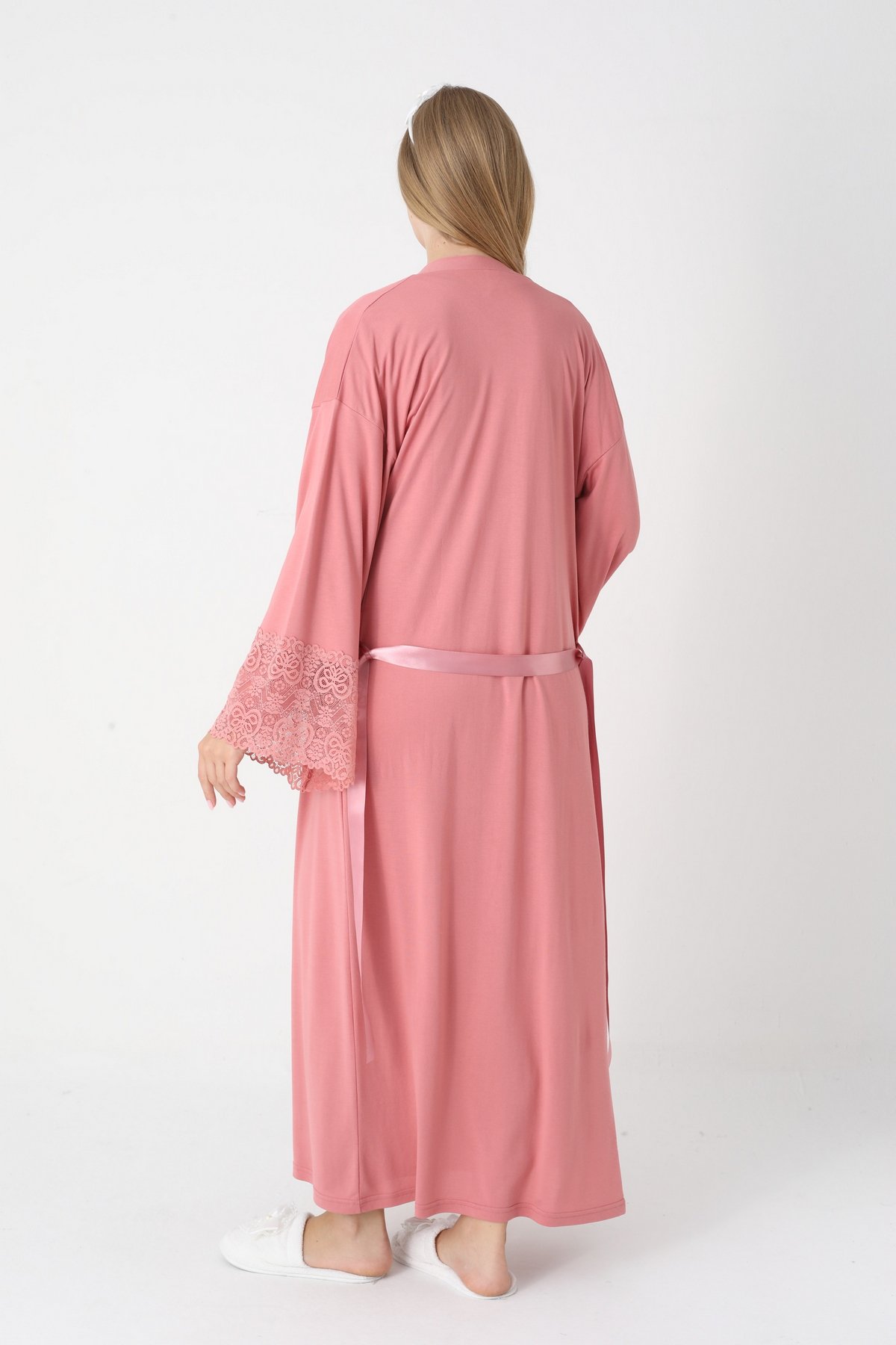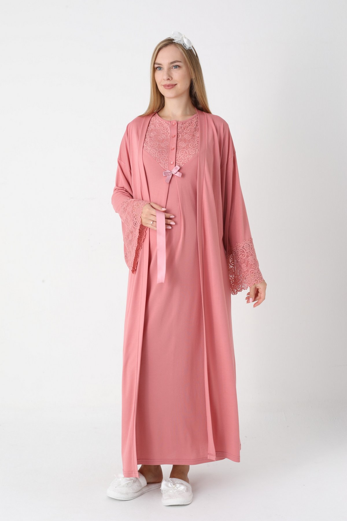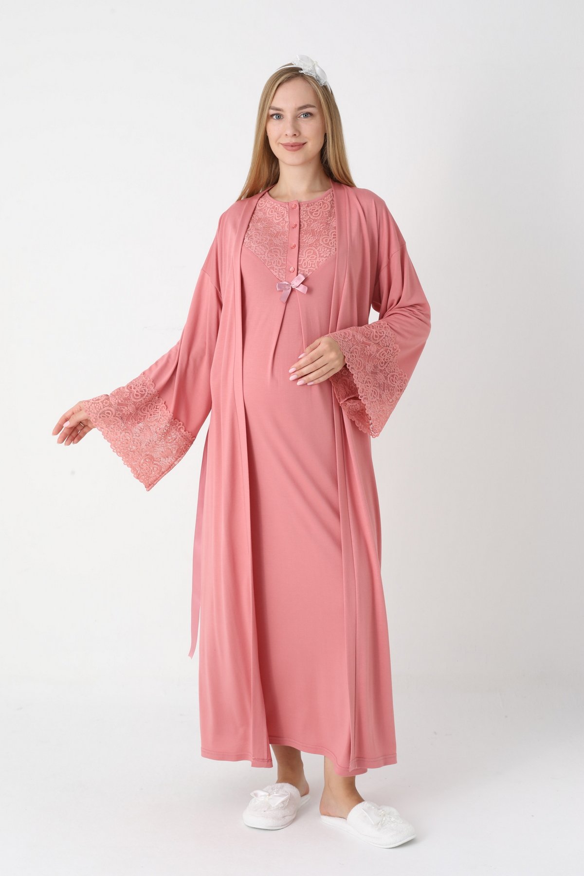 Narçiçeği Renkli, Dantel Detaylı, Uzun Kollu Lüks Erdeniz 2309 Viskon Sabahlıklı Lohusa -Hamile Pijama Takımı | QuillingSeti.com