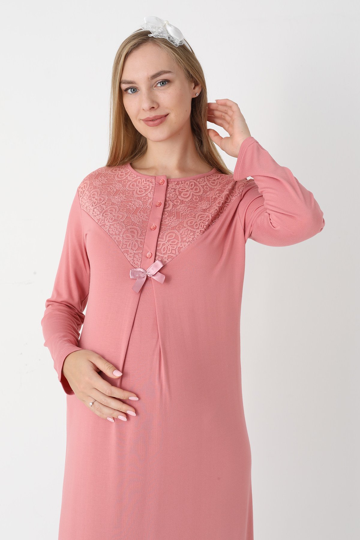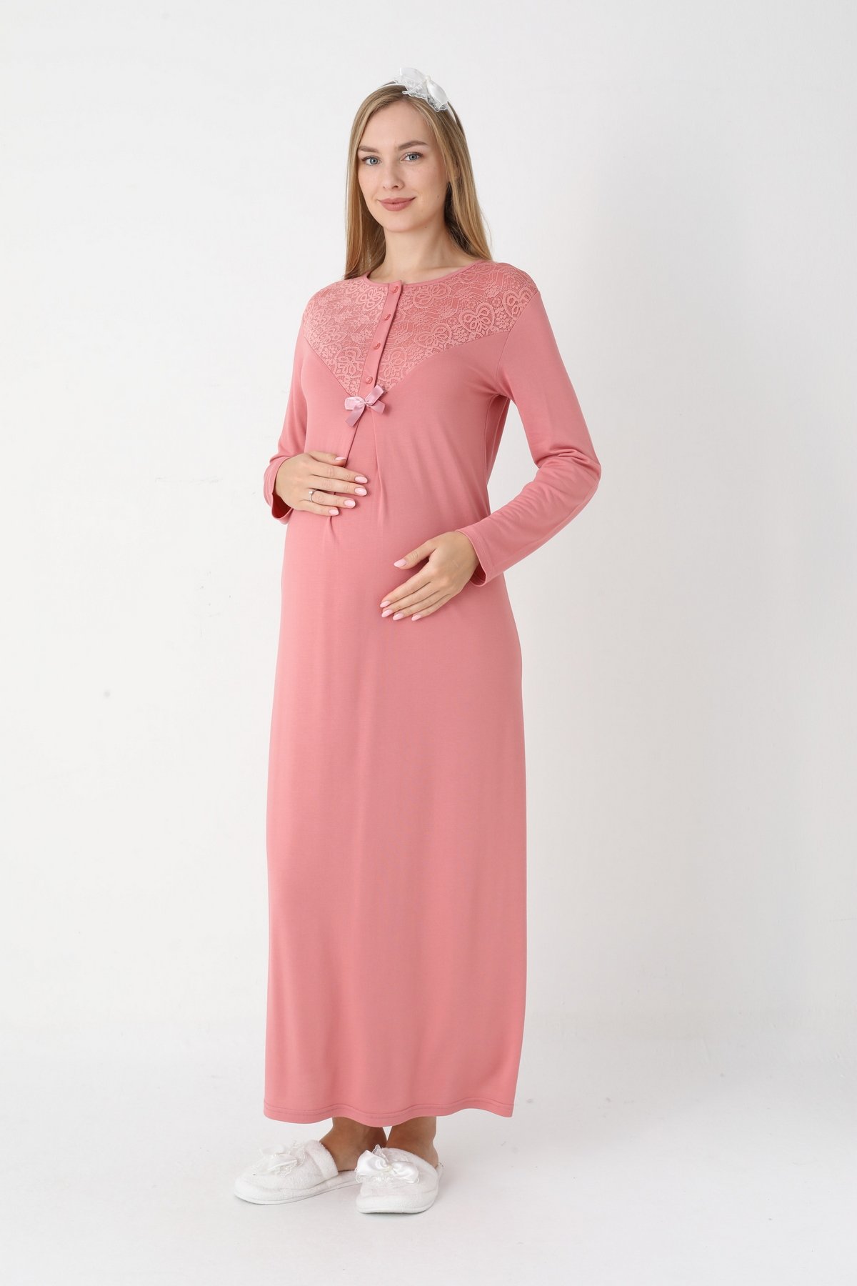 Pratik Emzirme Çözümü: Geceliğin göğüs kısmındaki düğmeli emzirme bölmesi, bebeğinizi tek elle zahmetsizce ve hızlı bir şekilde emzirmenize olanak tanıyarak mahremiyetinizi korur.