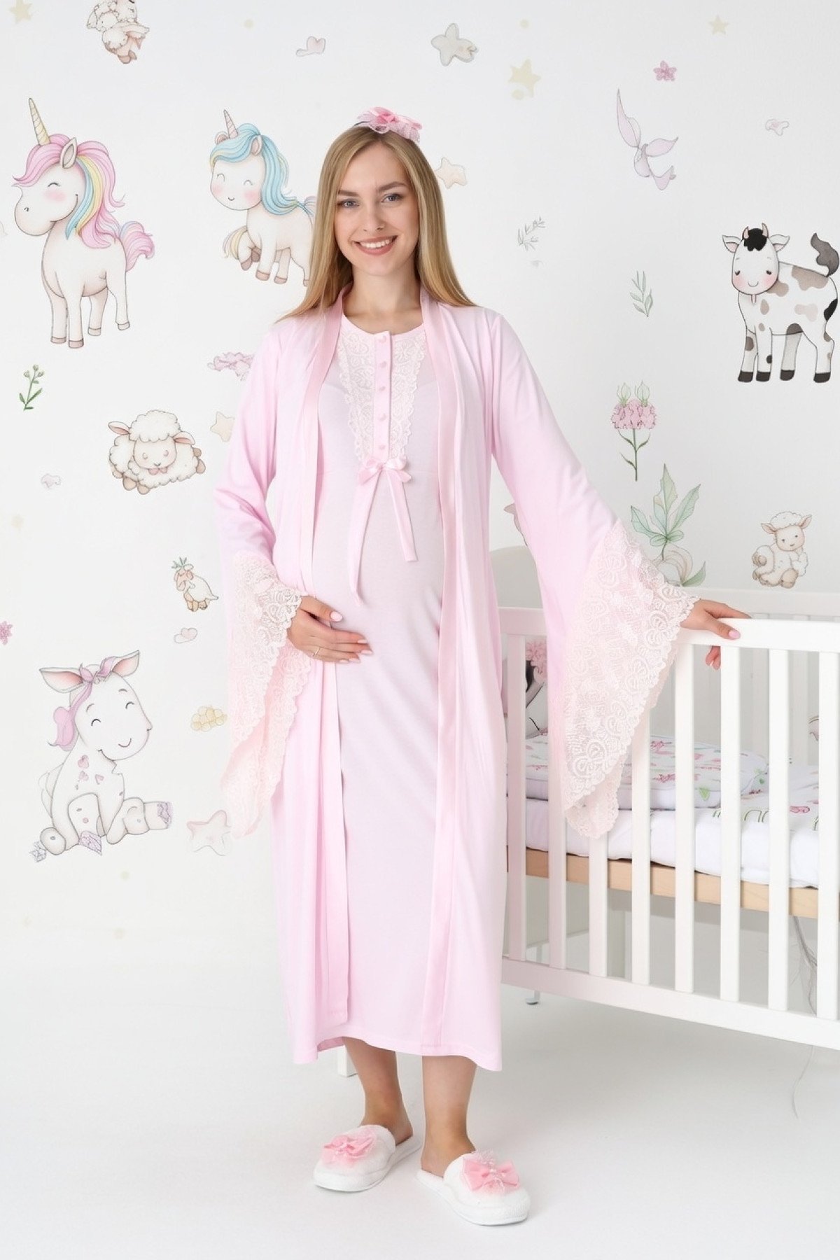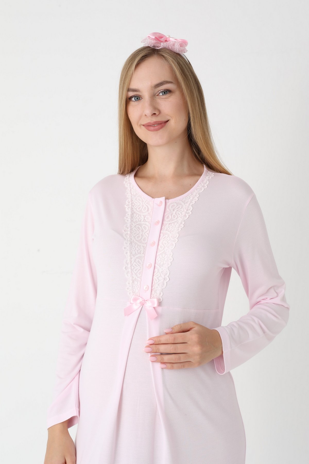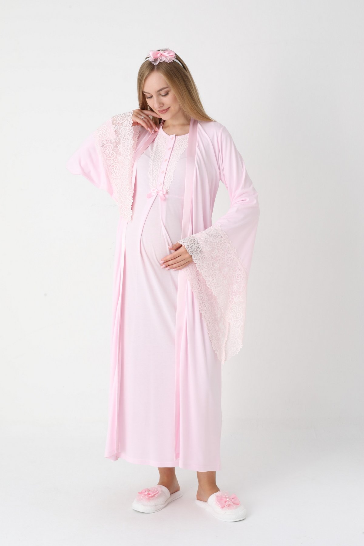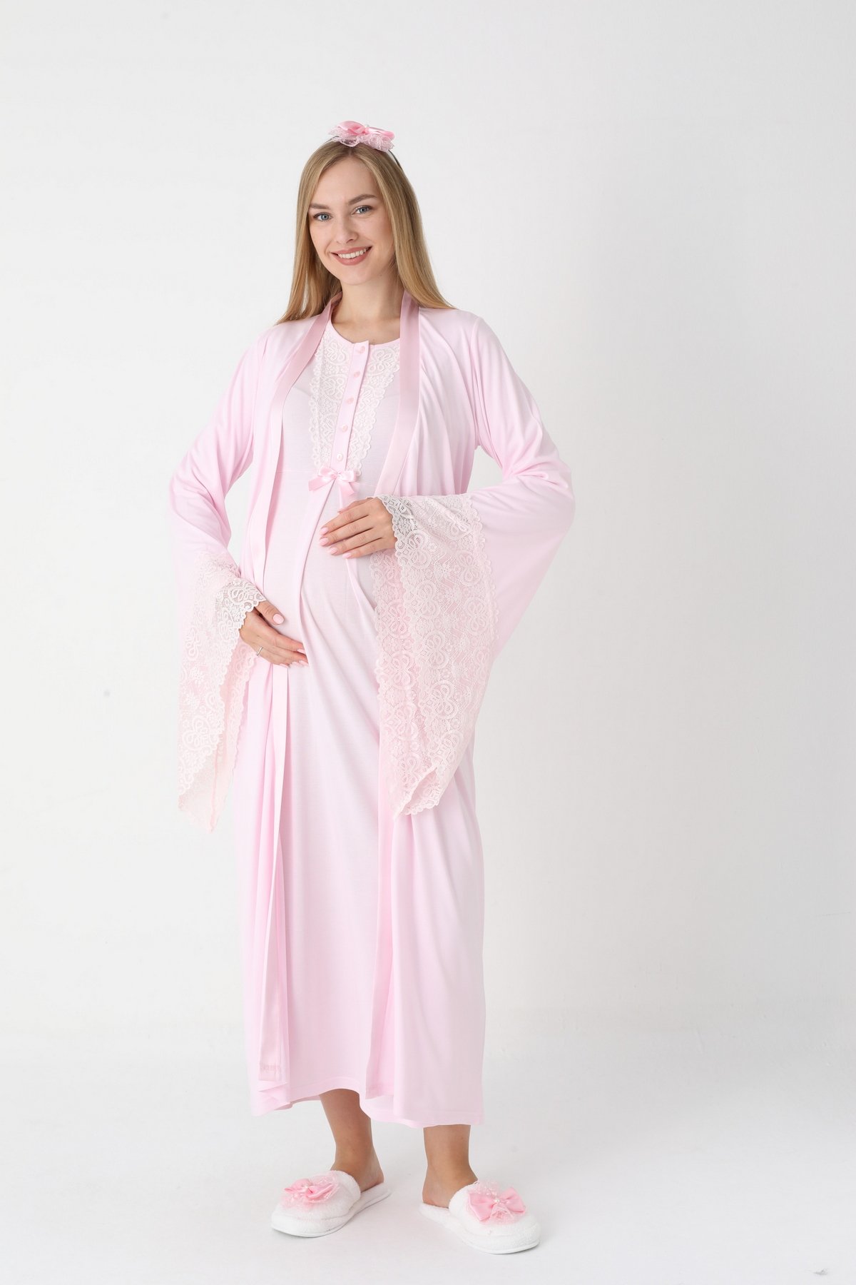 Pembe Renk Dantel Detaylı Derin Patlı, Erdeniz 3420 Uzun Kol ve Sabahlıklı 3lü Lohusa Pijama Takımı