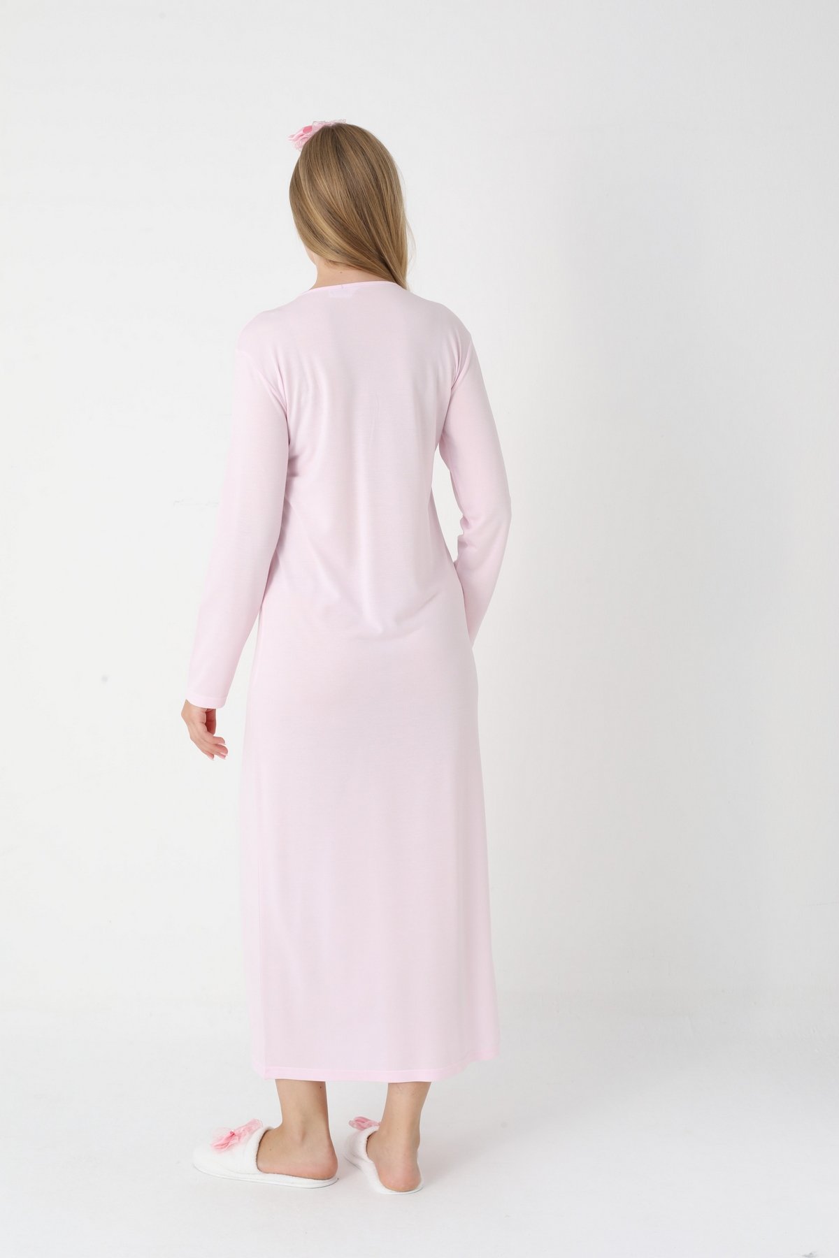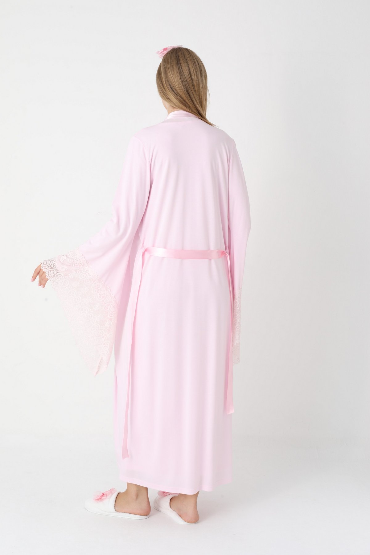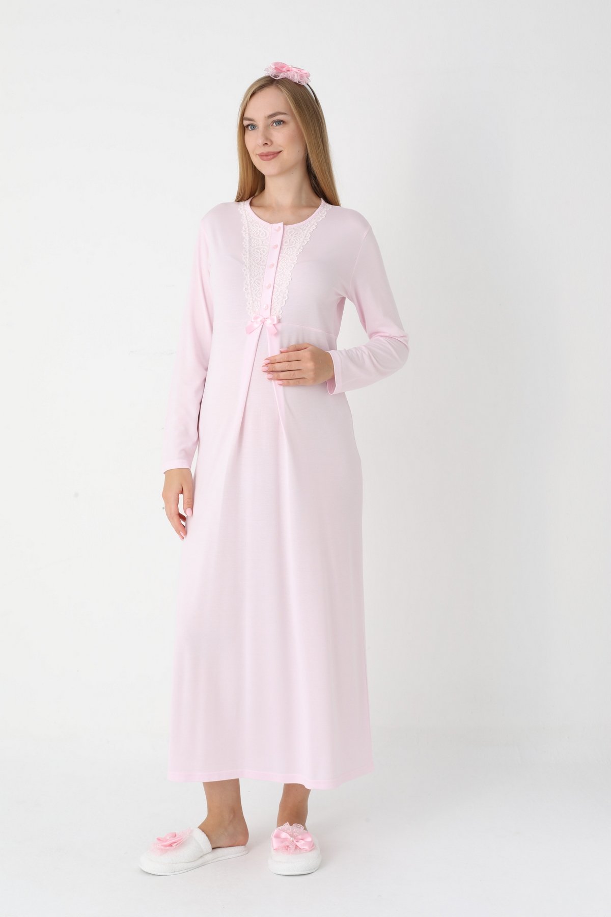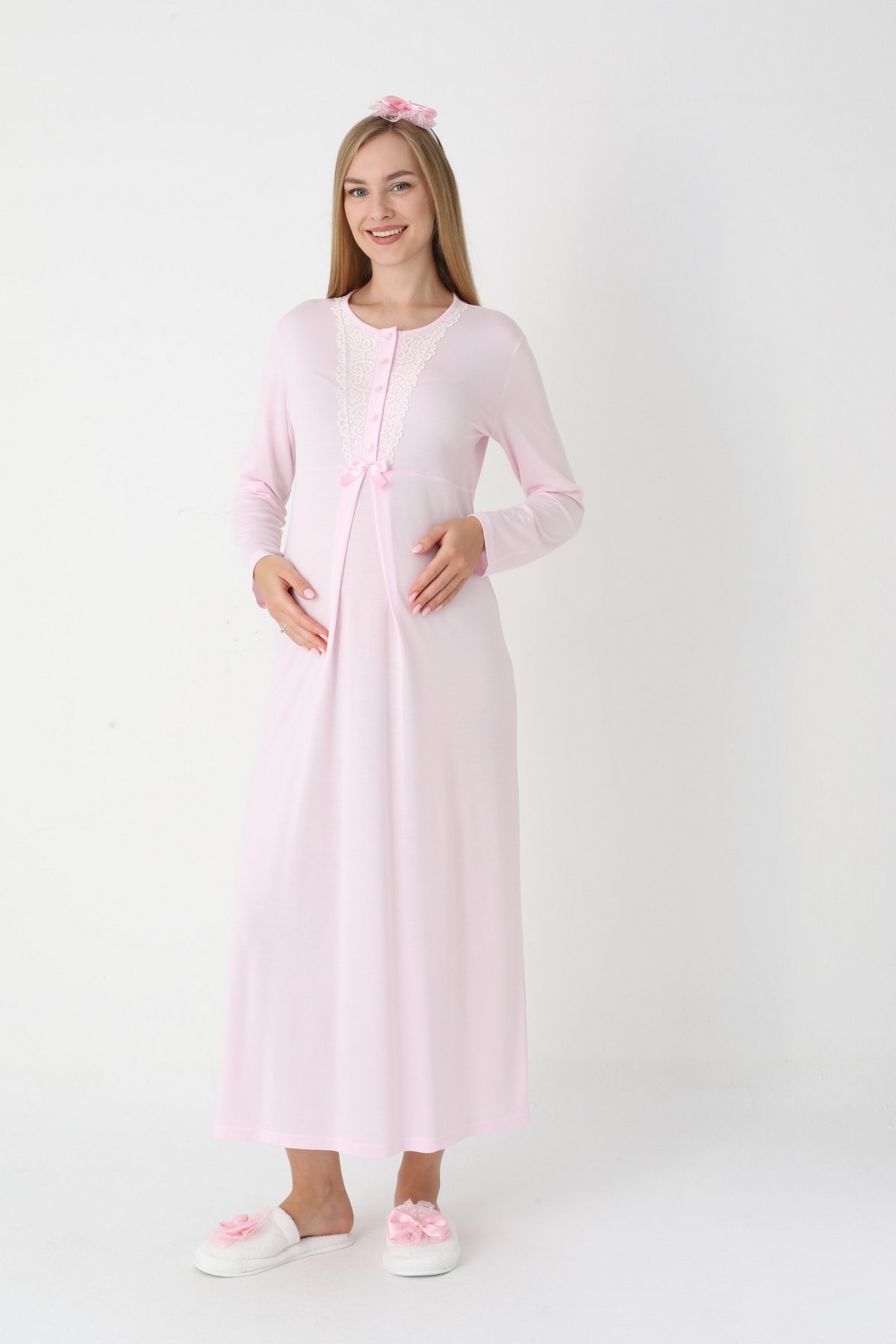 Erdeniz 2303 Pembe Dantelli Uzun Kollu Viskon Lohusa Gecelik & Sabahlık Seti | QuillingSeti.com