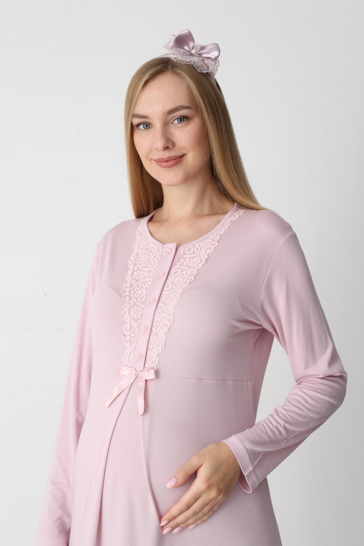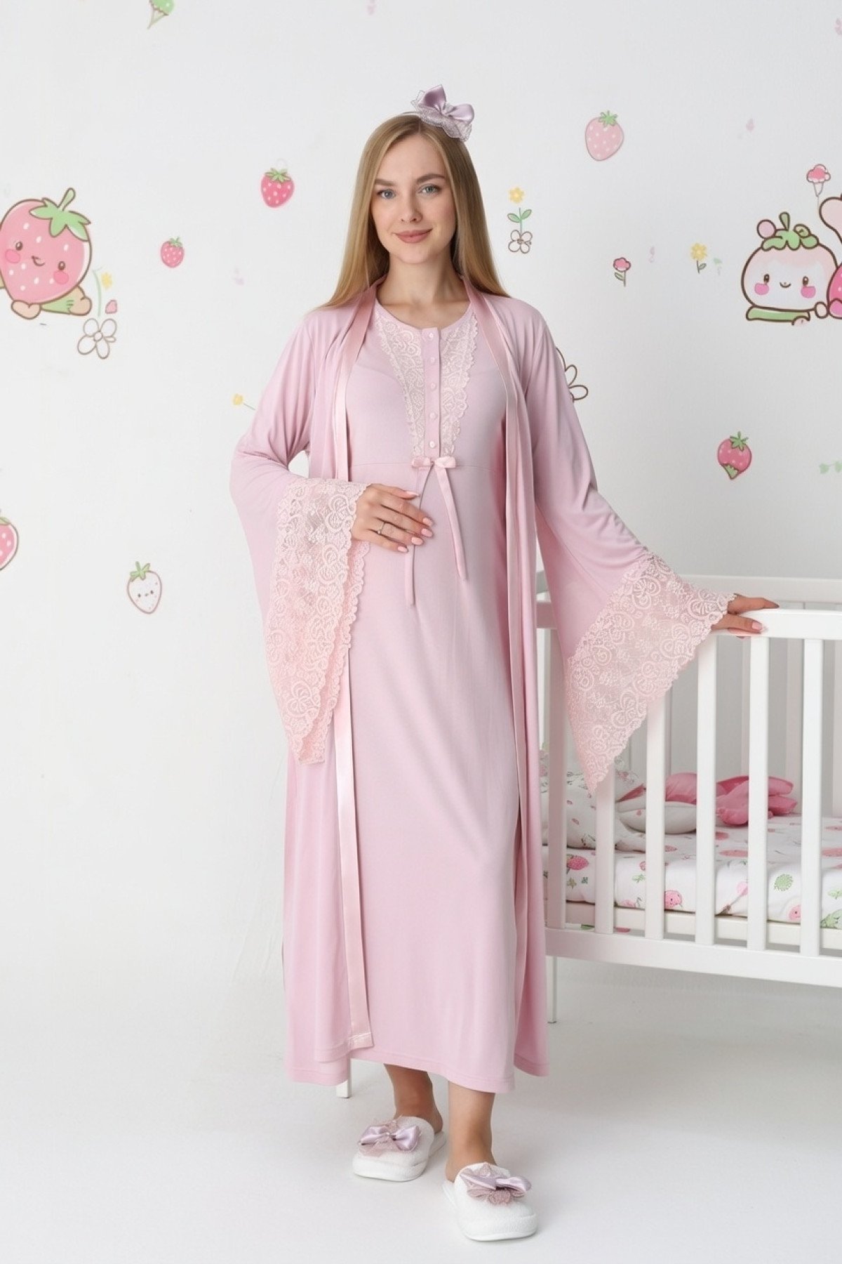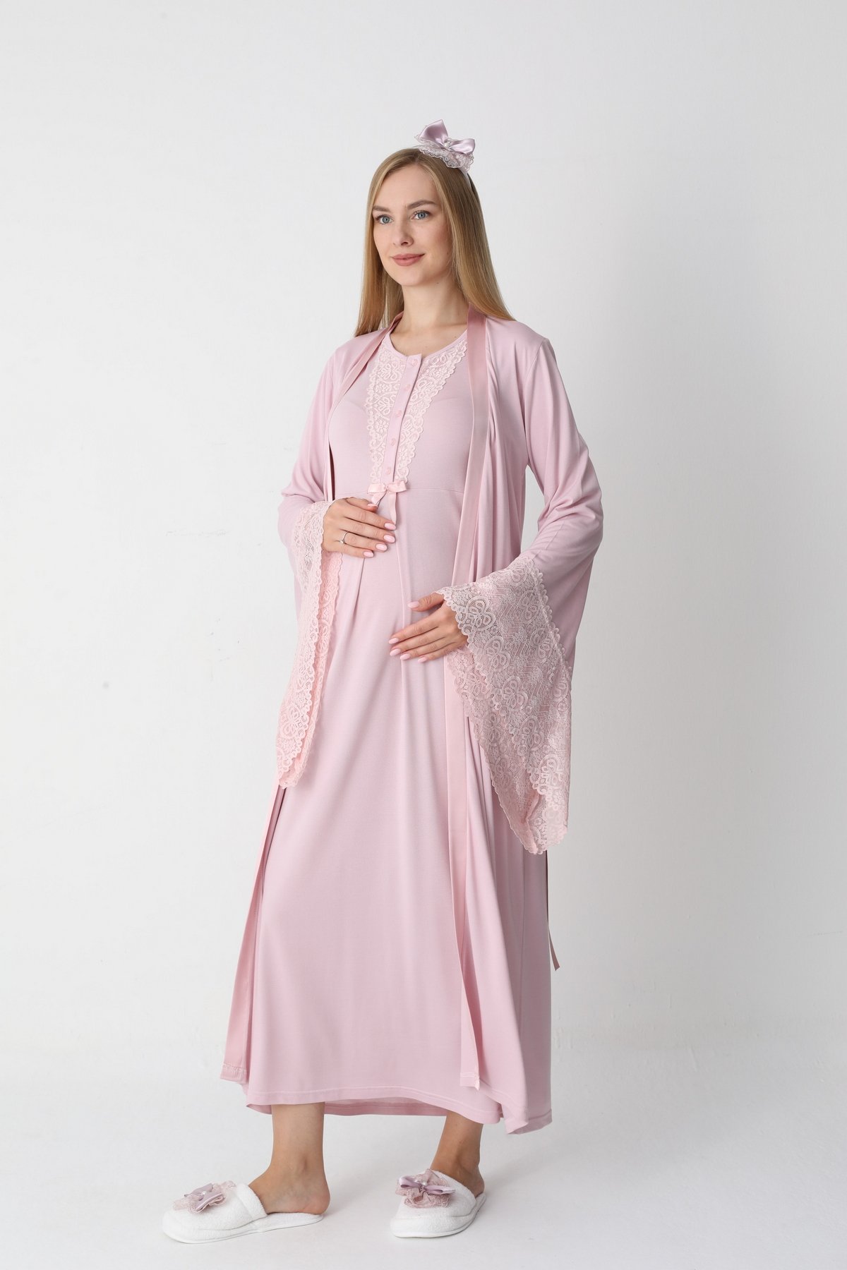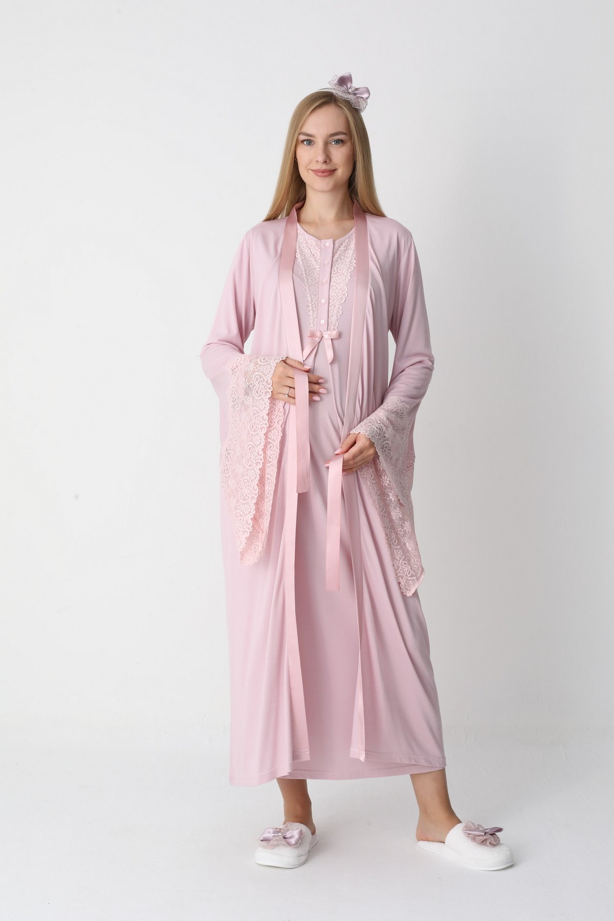 Pembe Renk Dantel Detaylı Derin Patlı, Erdeniz 3420 Uzun Kol ve Sabahlıklı 3lü Lohusa Pijama Takımı