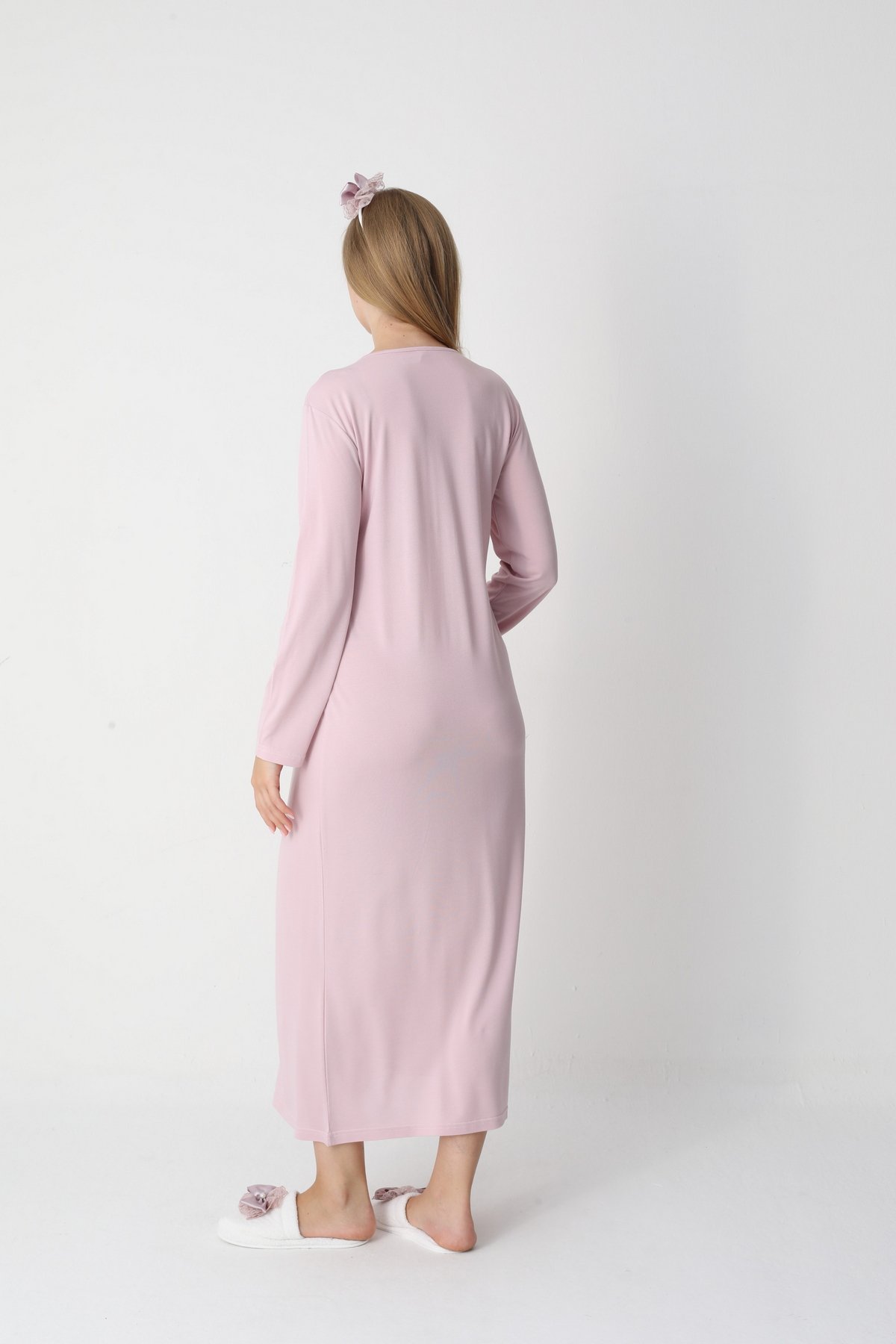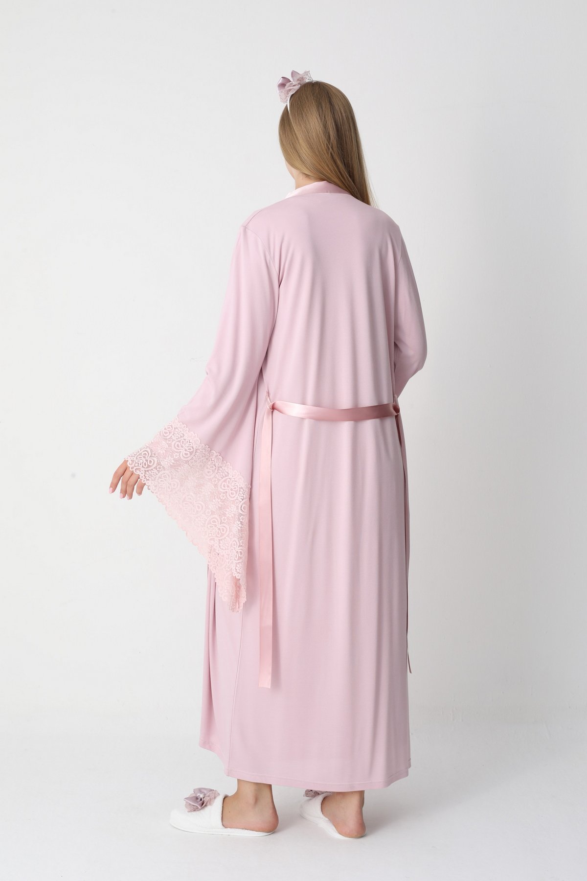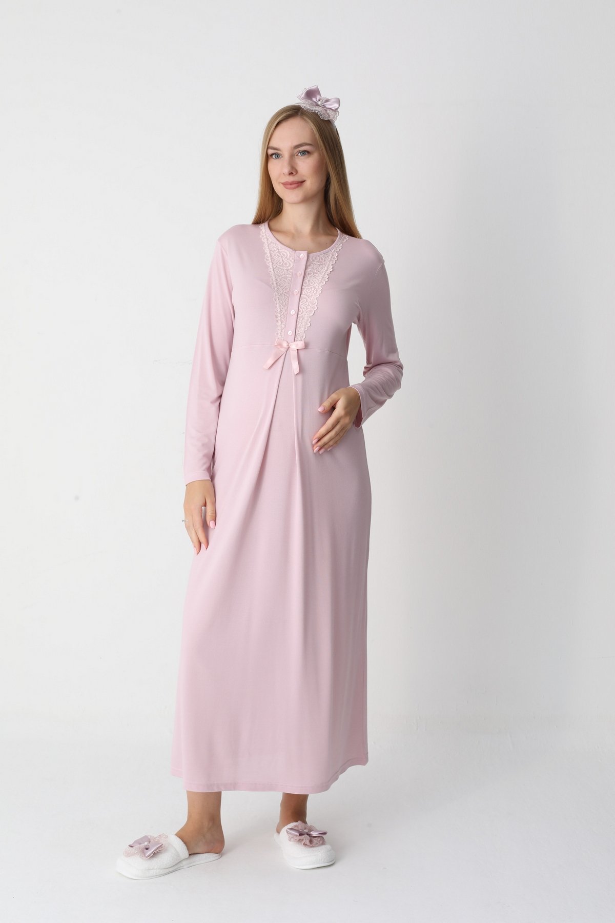 Erdeniz 2303 Pudra Dantelli Uzun Kollu Viskon Lohusa Gecelik & Sabahlık Seti | QuillingSeti.com