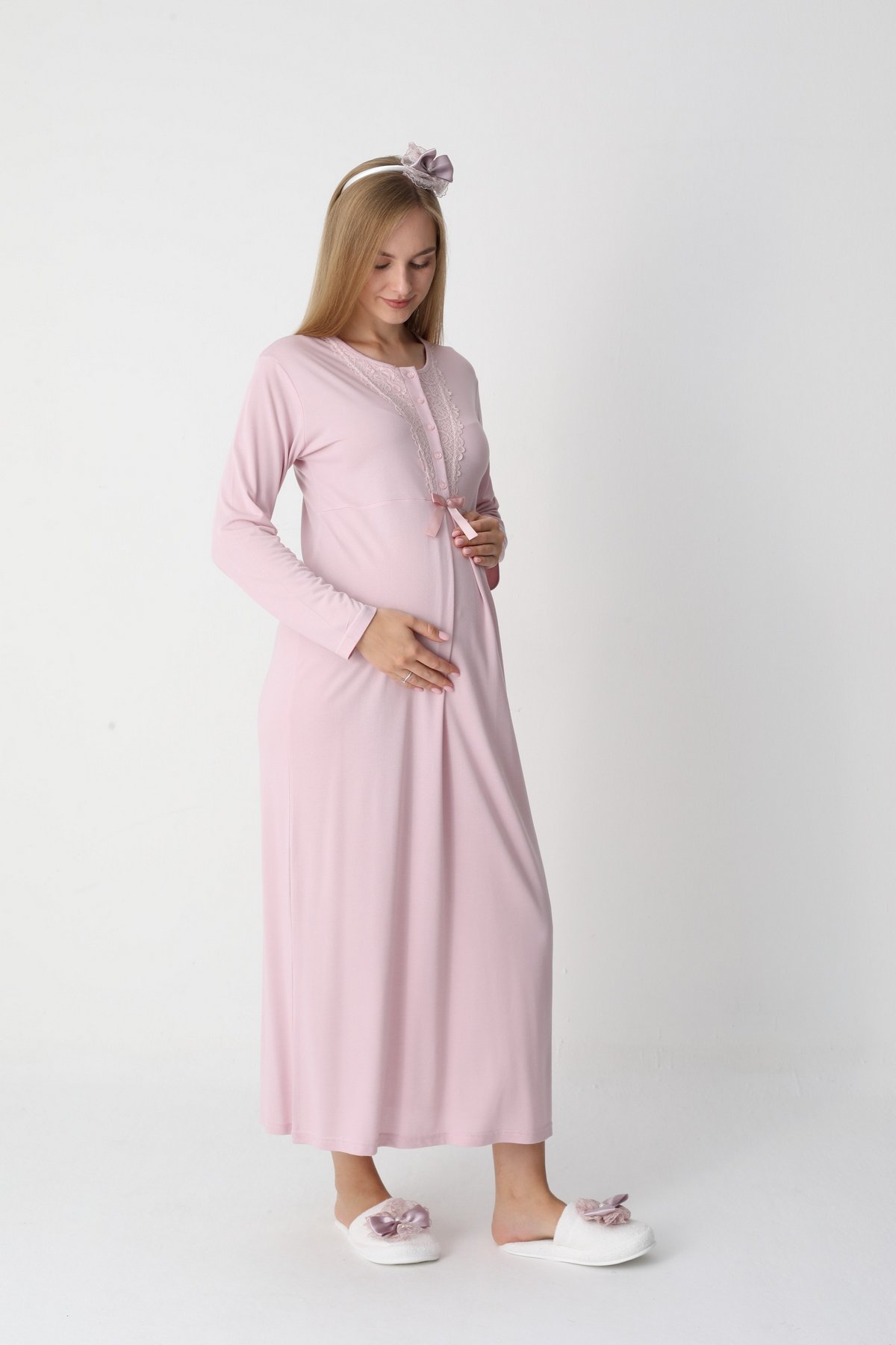 Zarif Sade Tasarım ve Dantel Detayları: Göğüs dekoltesi ve sabahlık kollarındaki romantik dantel işlemeleri, düz ve sade renk tasarımıyla birleşerek doğum çekimlerinizde kusursuz bir zarafet sergilemenizi sağlar.