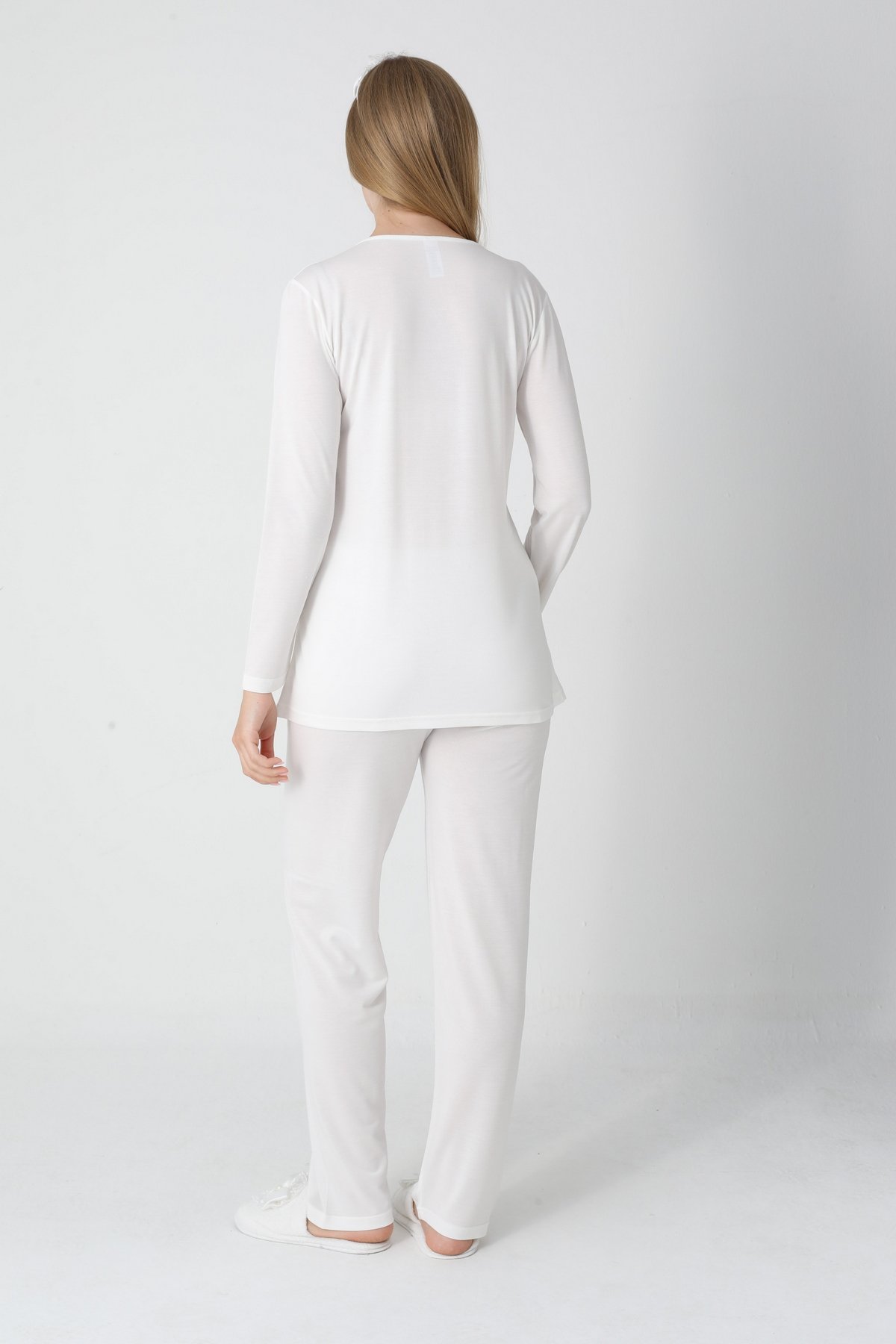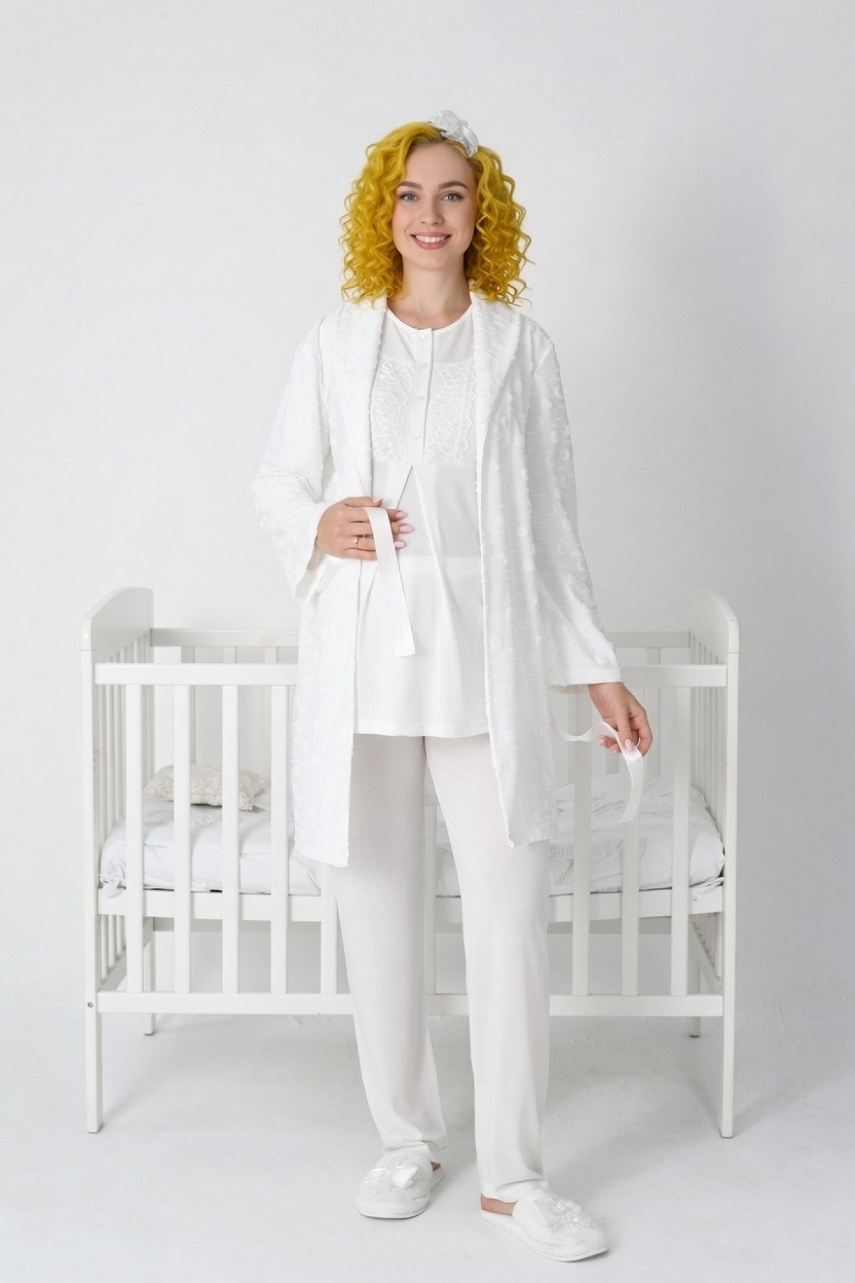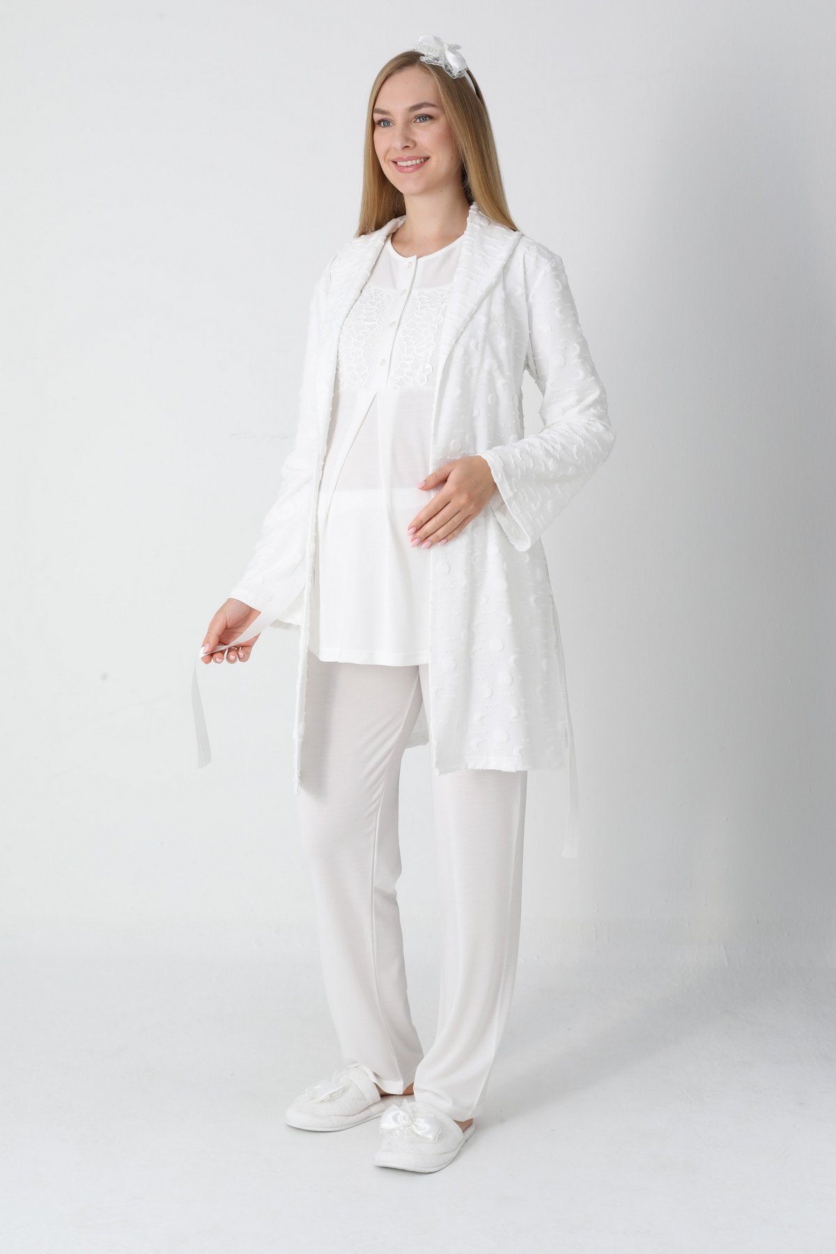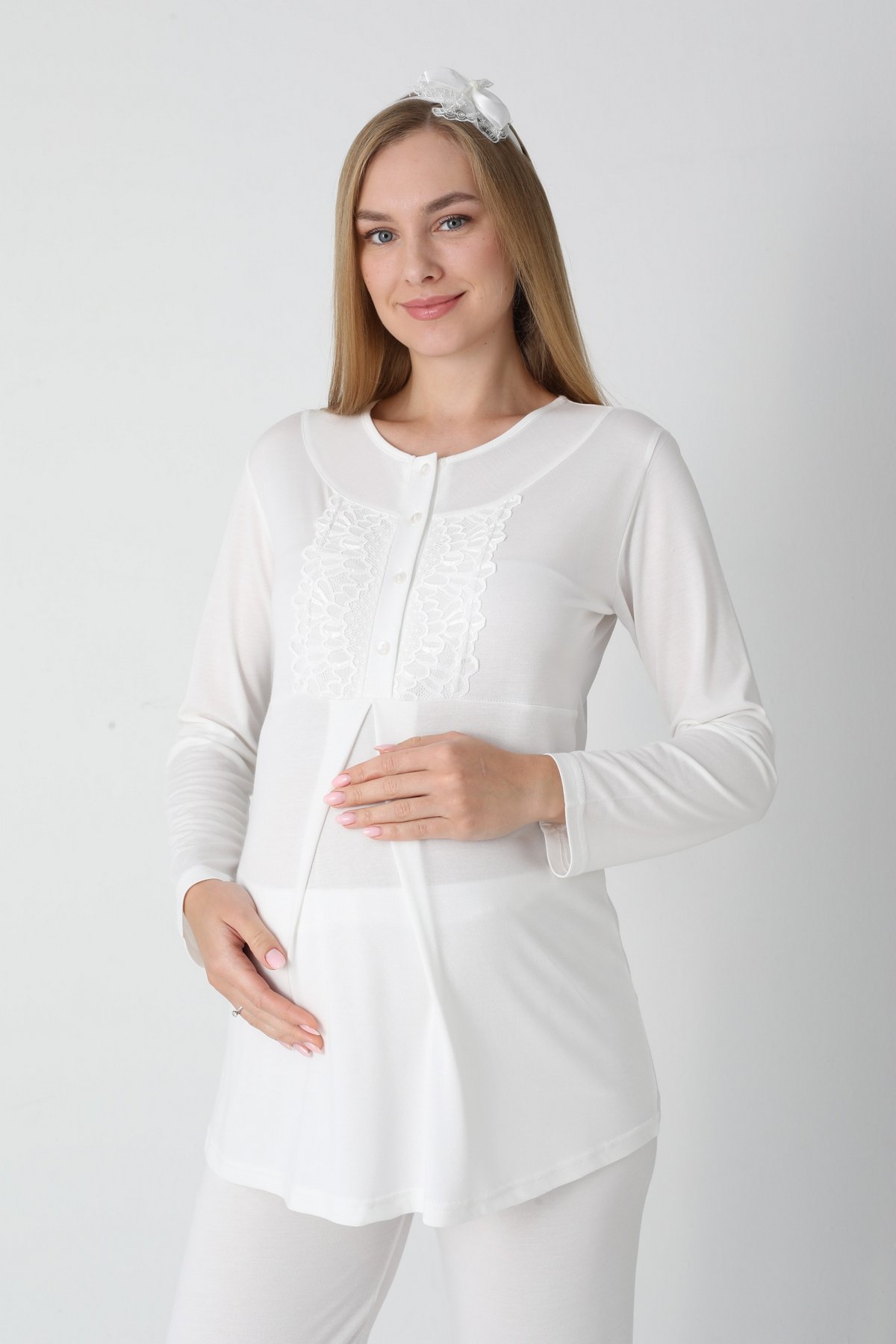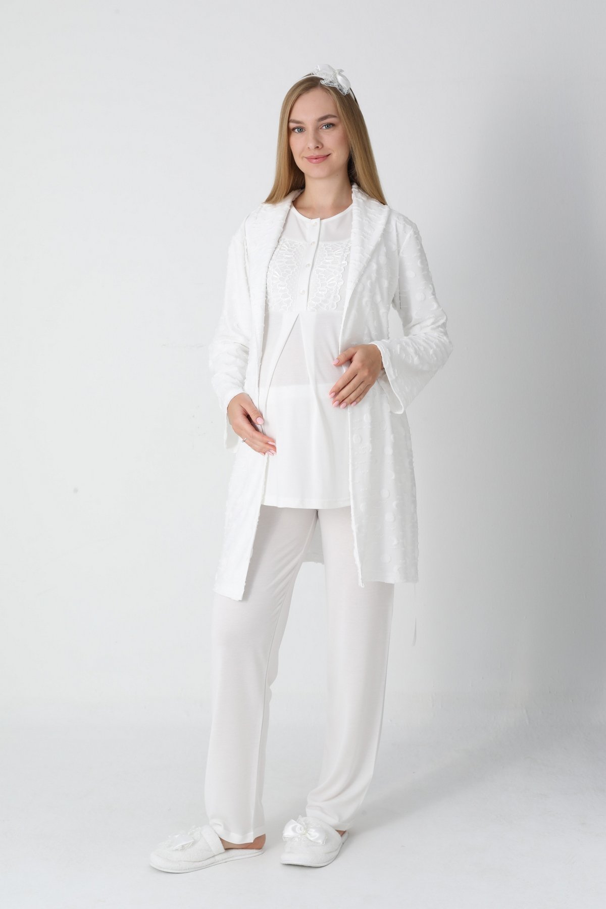 Zarif Dantel İşlemeleri: Yaka ve kol uçlarındaki sofistike dantel detaylı süslemeler, lohusa sürecinde kendinizi bakımlı hissettirir; doğum fotoğraf çekimleri için ideal bir görünümdür.