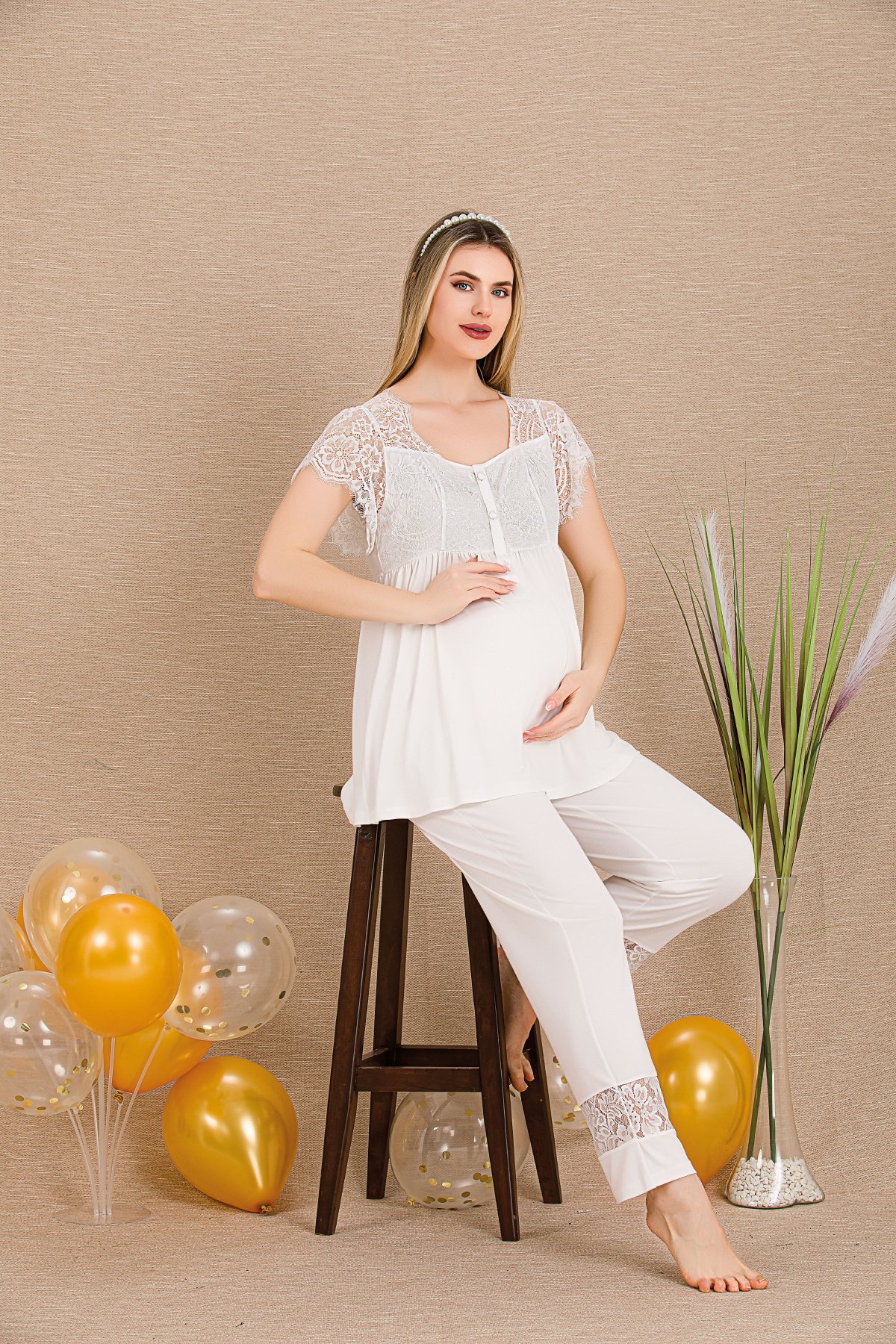 Ekru Renkli Derin Patlı, 33002 Sabahlıklı 3lü Lohusa Hamile Pijama Takımı | Lohusa-Sepeti.com