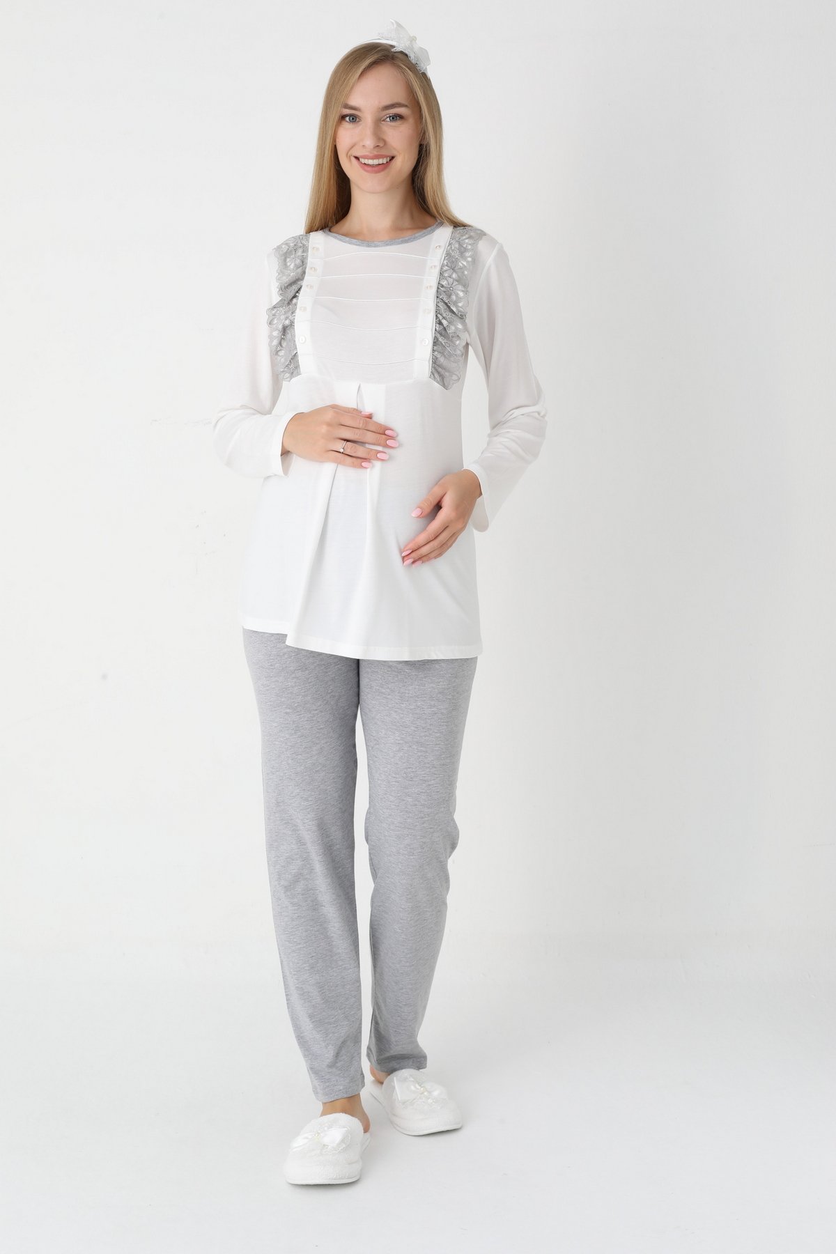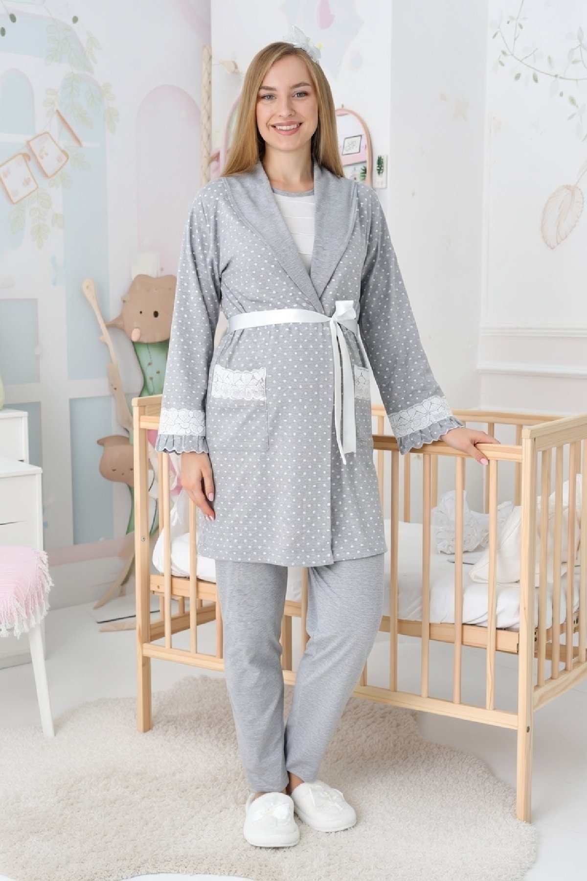 - Ürün İçeriği: Üst (düğmeli emzirme), Alt Pijama (lastikli) ve Sabahlık (kuşaklı).