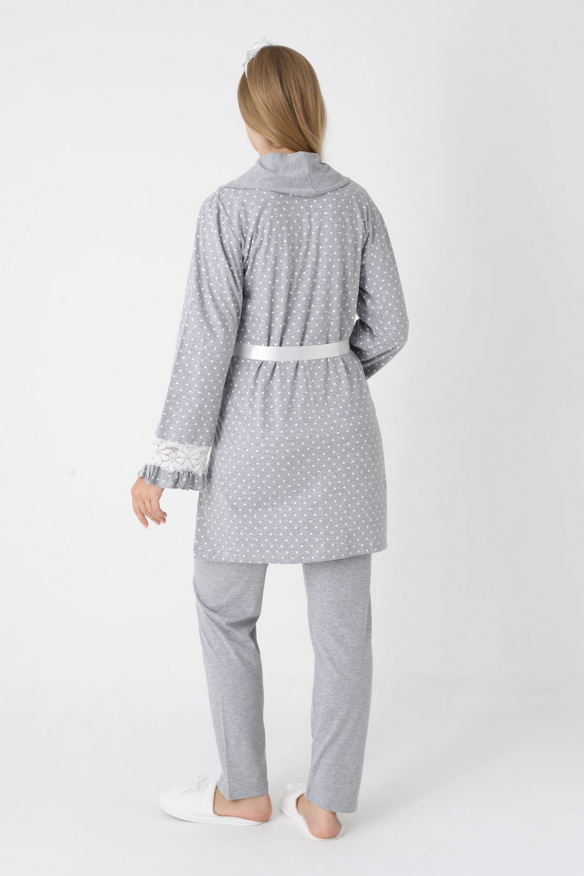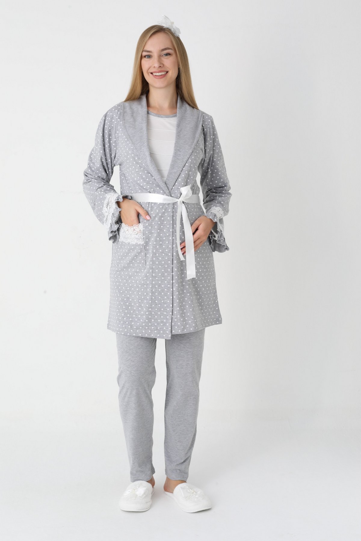 Konfor ve Zarafet Bir Arada: Erdeniz 3 Parça Puantiye Desenli Sabahlıklı ve Uzun Kollu Lohusa Hamile Pijama Takımı;