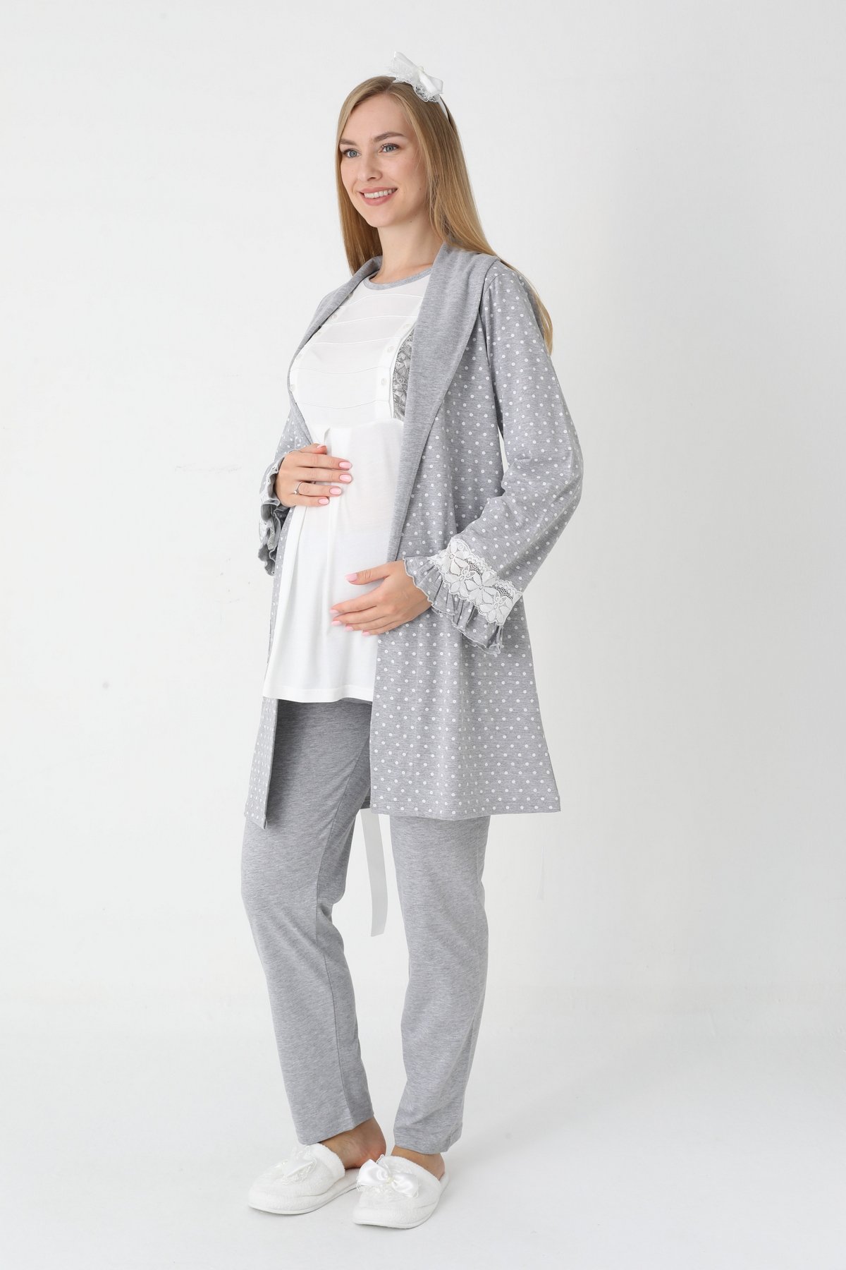 Erdeniz Puantiyeli 3'lü Penye Hamile & Lohusa Pijama Takımı ve Sabahlık Seti