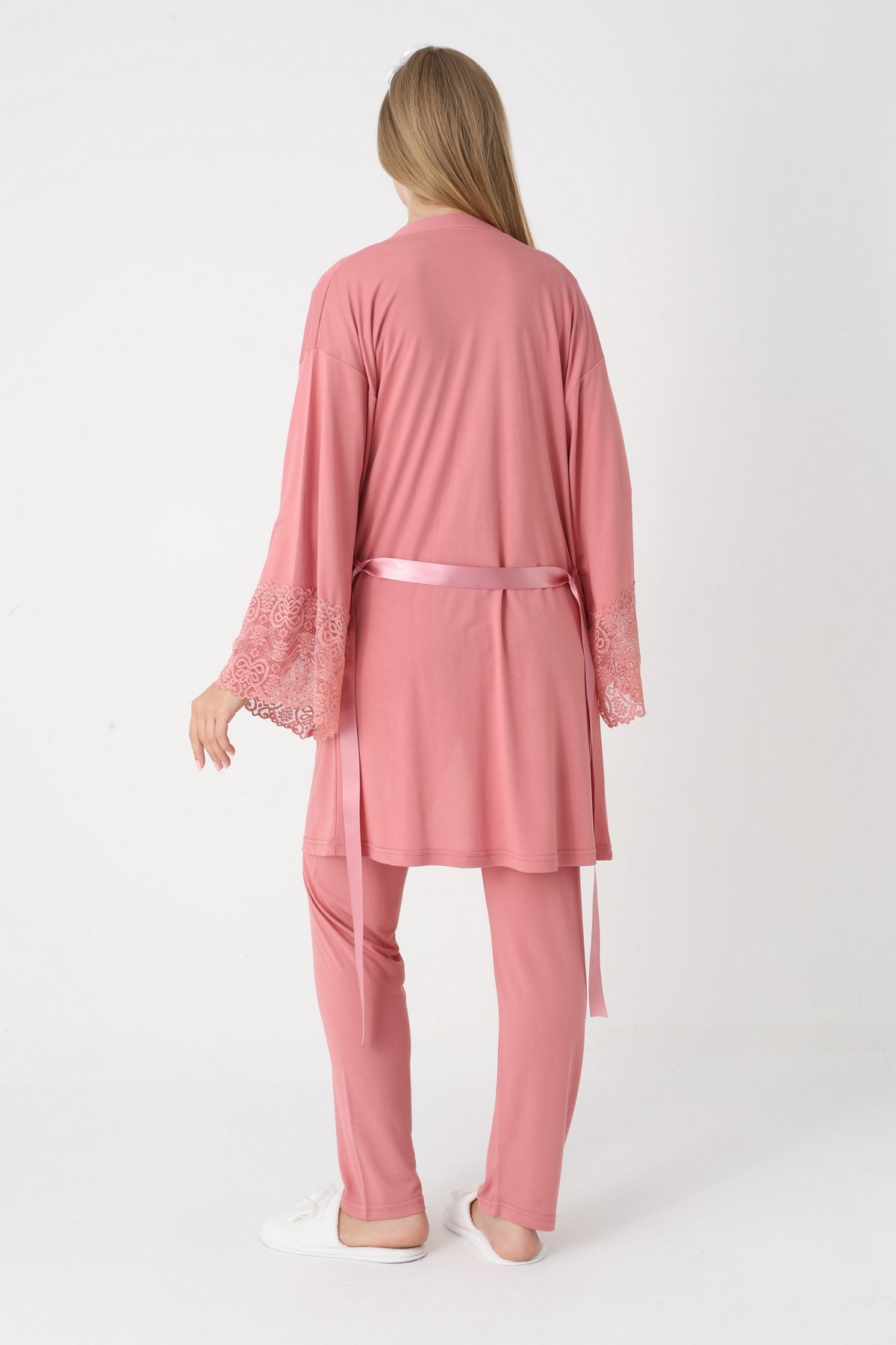 Erdeniz 3449 Vizon (Bej) ve Narçiçeği Renk Seçenekli Dantel Detaylı Sabahlıklı 3’lü Lohusa Pijama Takımı