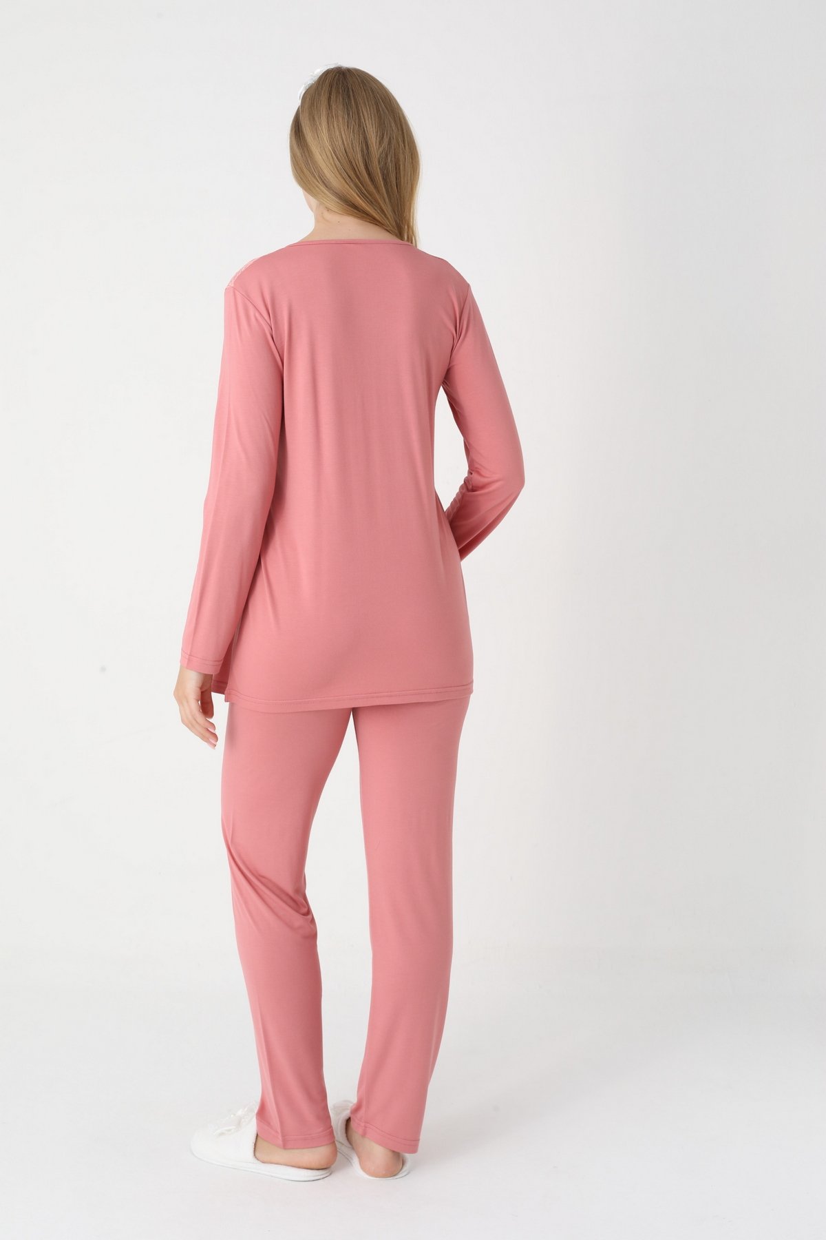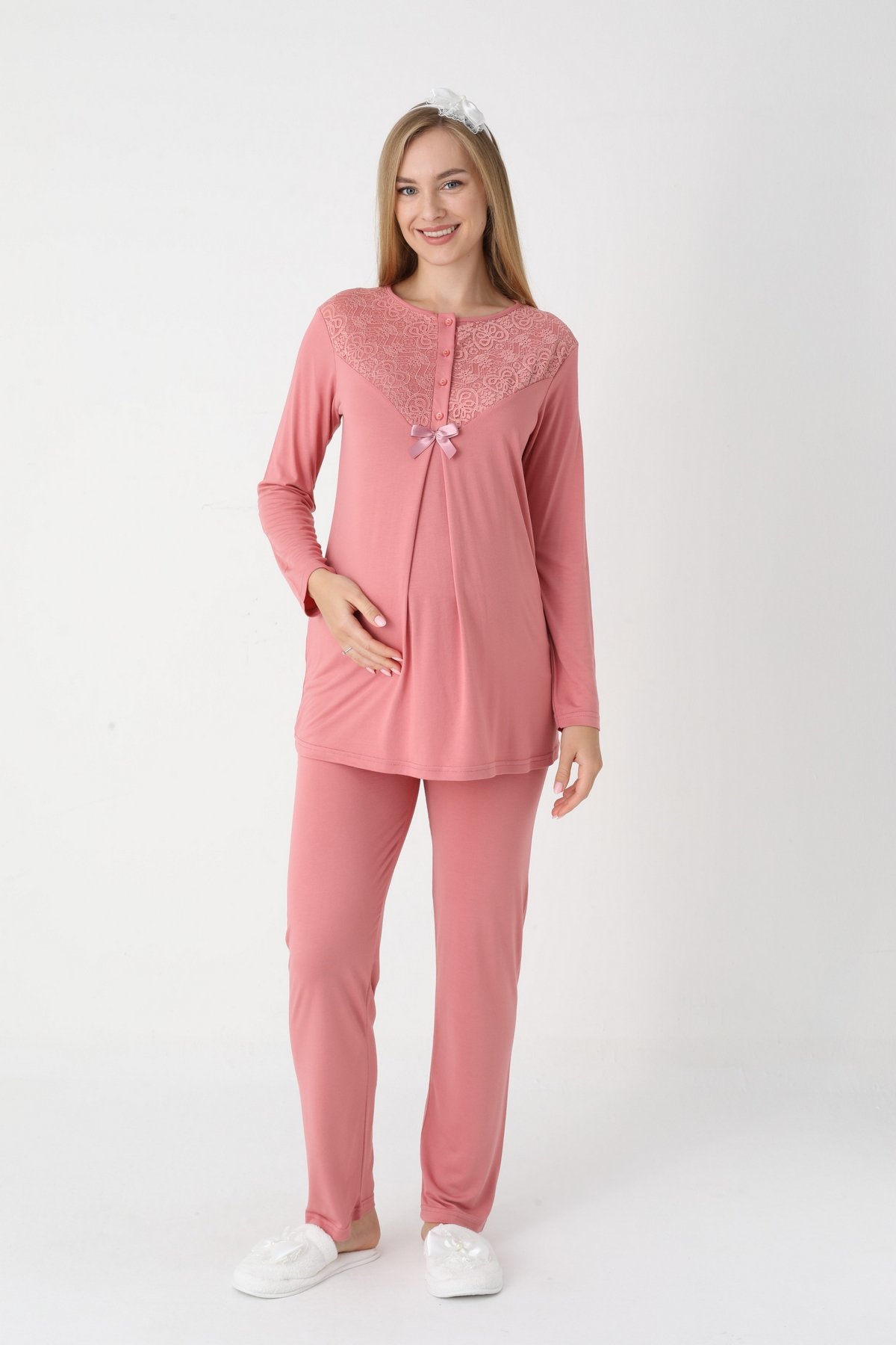 Pembe Renk Dantel Detaylı Derin Patlı, Erdeniz 3420 Uzun Kol ve Sabahlıklı 3lü Lohusa Pijama Takımı