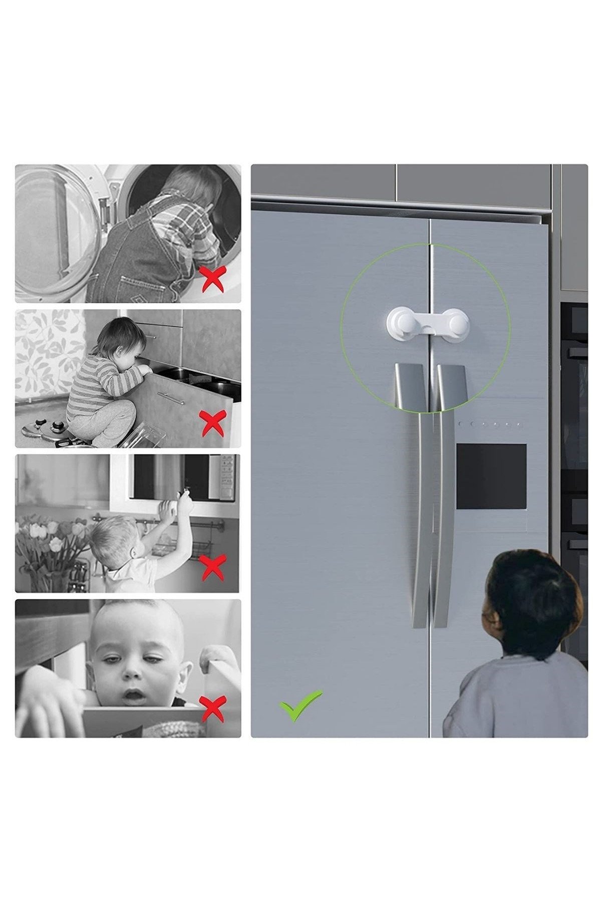 - Hızlı ve Pratik Çözüm: Bebeklerin ve küçük çocukların çekmeceleri, dolapları ve diğer eşyaları açmasını engeller.