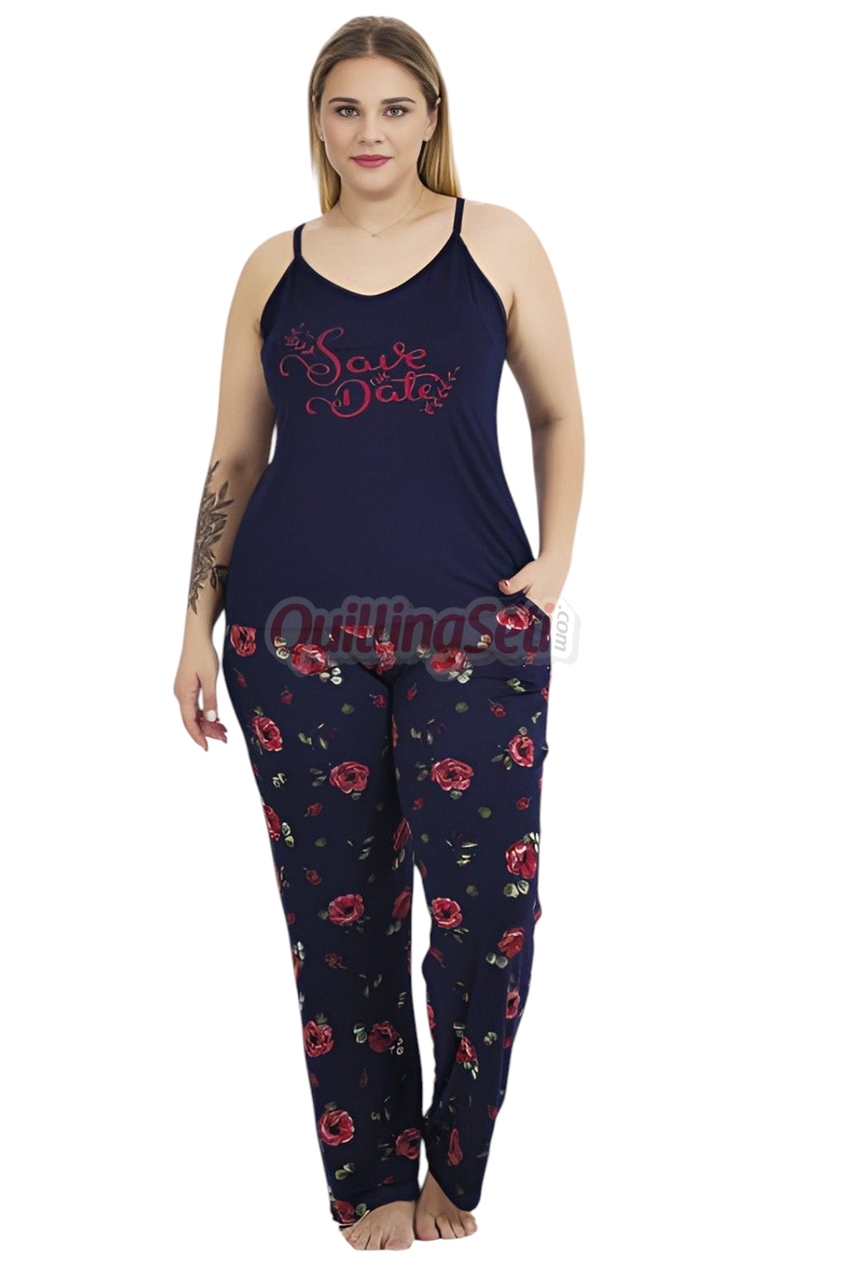 Lacivert Renk ve Çiçek Desenli Lady 11019 Kadın Askılı Kol Büyük Beden Anne Pijama Takımı