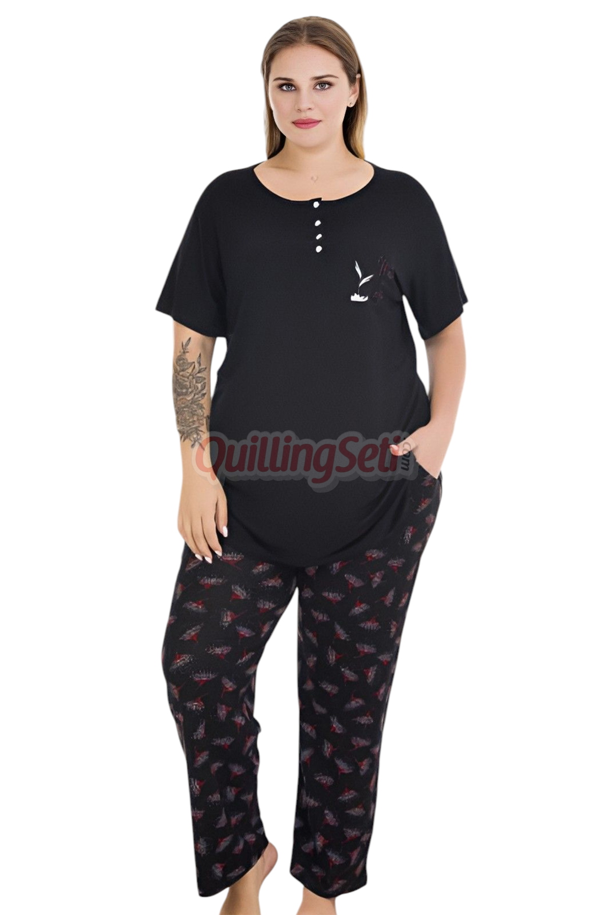 - Bu şık ve rahat pijama takımı, cilt dostu yapısıyla uzun süreli kullanım imkânı sunar.