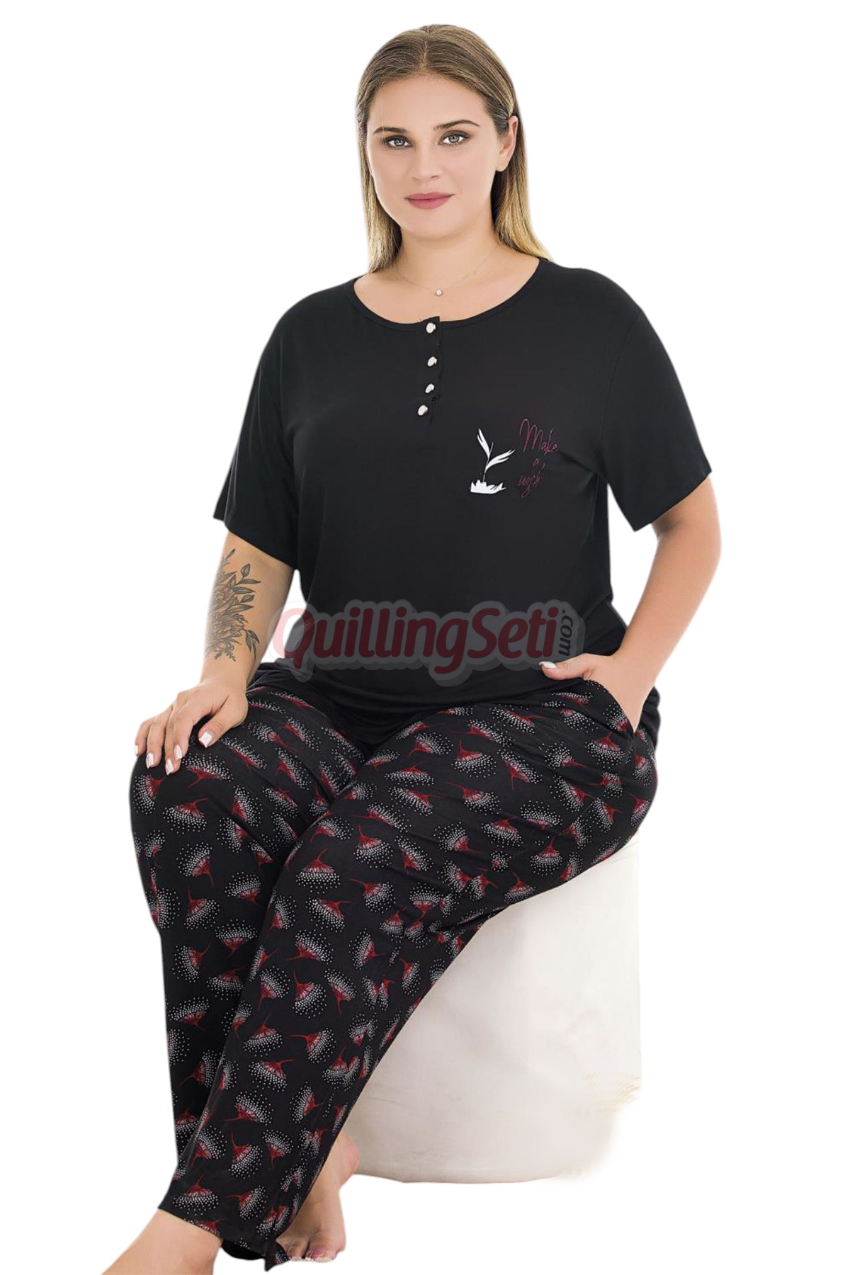 - Büyük beden penye pijama takımı, gece boyu rahat bir uyku deneyimi yaşamanız için idealdir; cildinize nefes aldırır, gün boyu biriken stresi hafifletir.