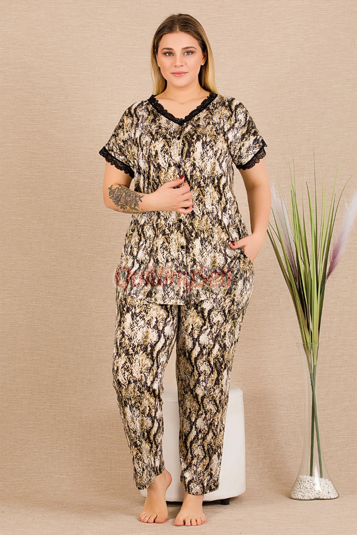 Siyah Renk ve Desenli Lady 11032 Kadın Kısa Kol Gömlek Yaka Büyük Beden Anne Pijama Takımı
