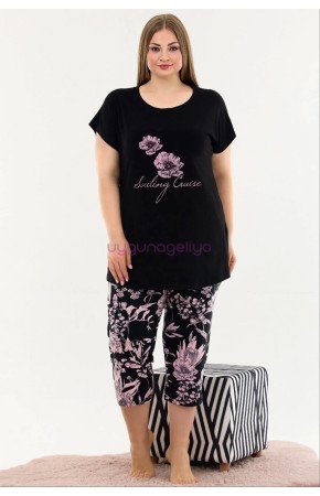 Siyah Renk Ve Çiçek Desenli Lady 10697 Kadın Büyük Beden Kapri Pijama Takımı