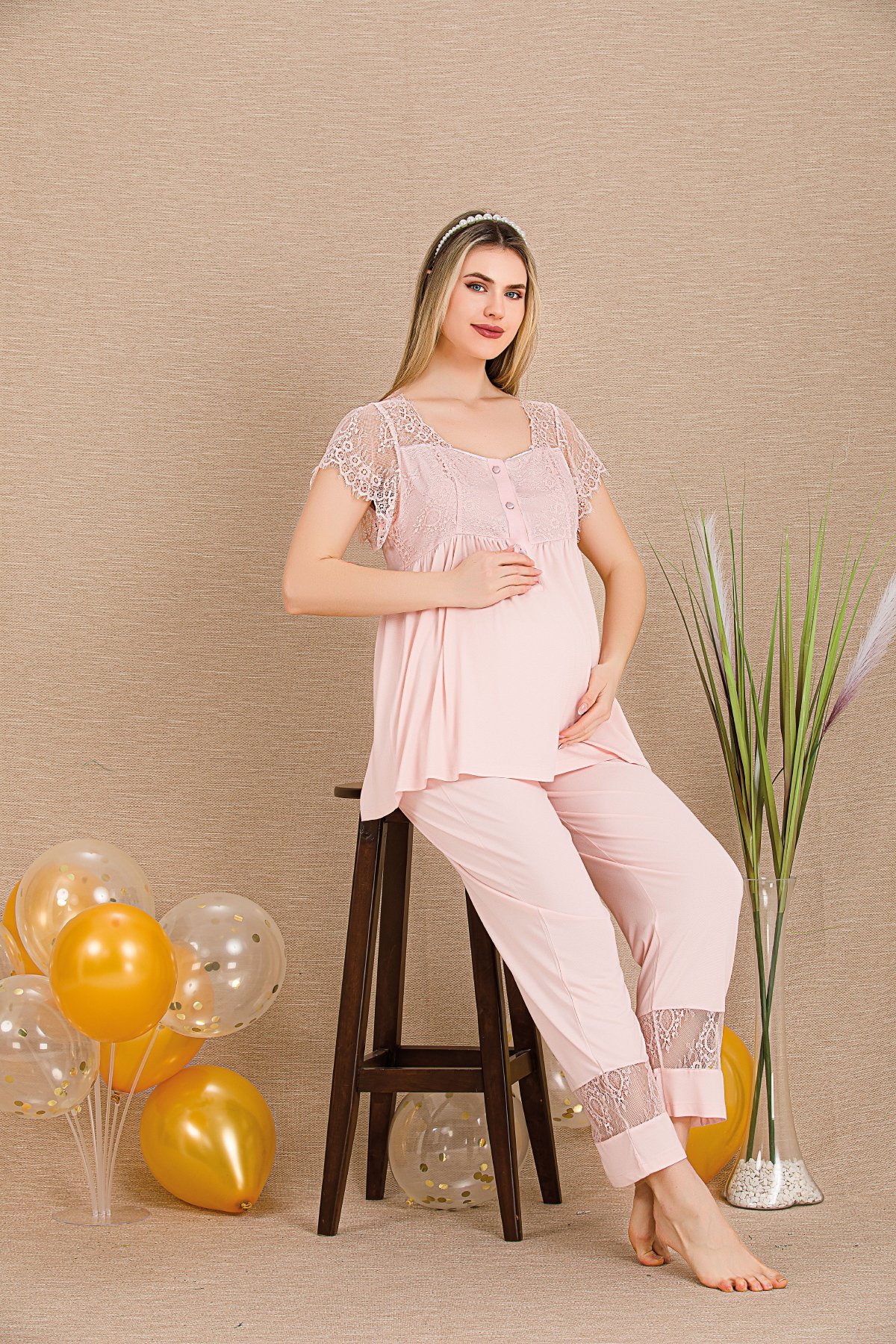 Somon Renk Dantel Detaylı Erdeniz 2285 Sabahlıklı 2li Hamile Gecelik Takım