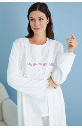 Ekru Renk Tuba 23566 Uzun Kol Dantel Detaylı 3 lü ve Sabahlıklı Hamile Pijama Takım Set